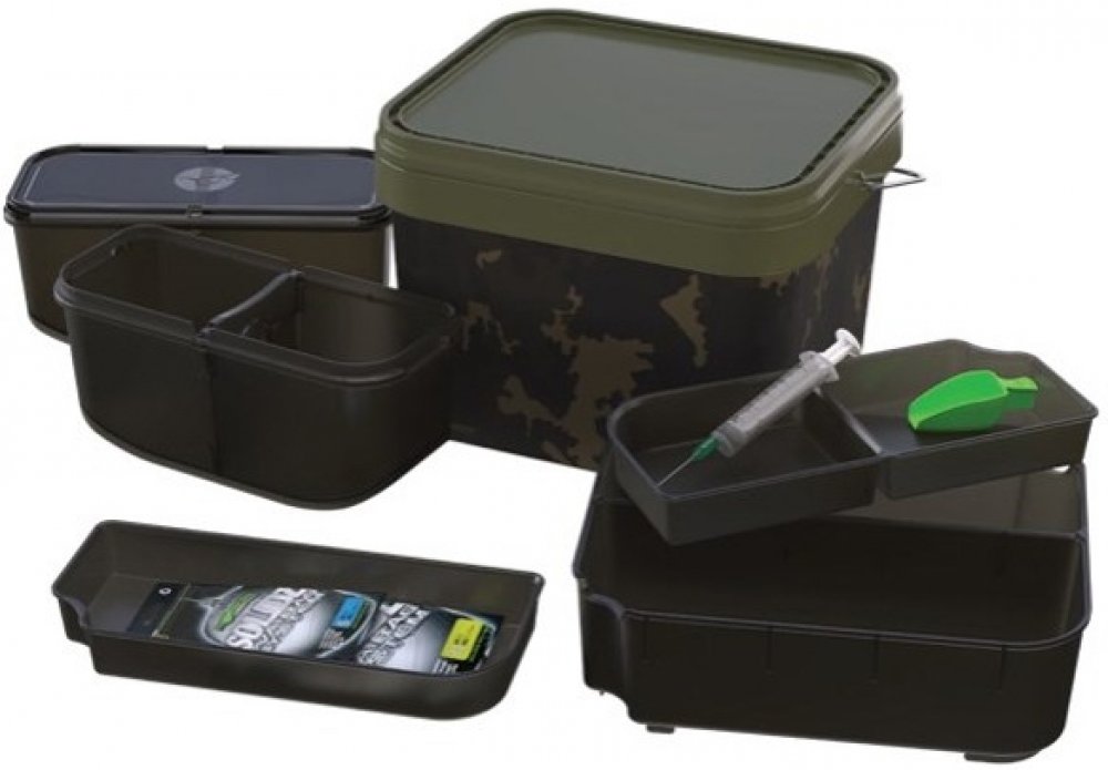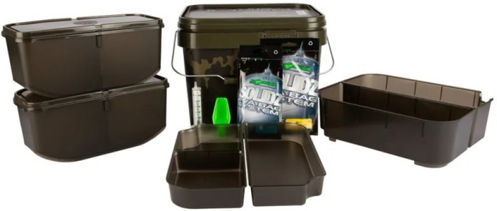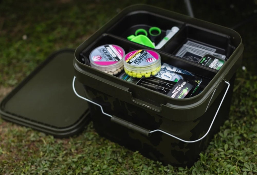 Nakonec je to vše uloženo v kbelíku Korda dark kamo 10L a jelikož jde o modulární systém, všechny komponenty se efektivně a přesně vejdou do kbelíku pro snadnou přepravu a skladování.