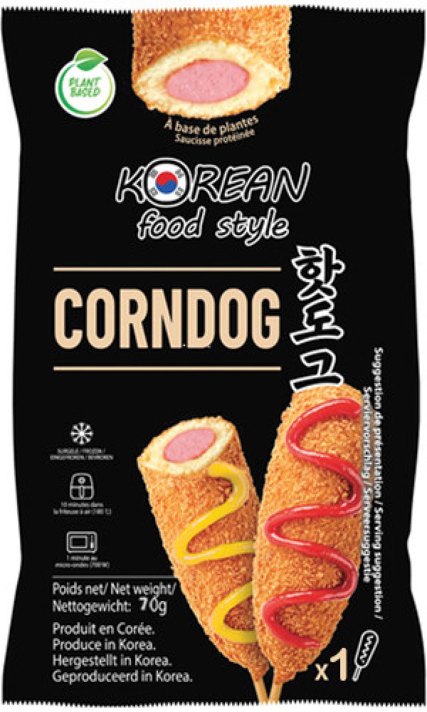 Křupavý, zlatavý a 100% rostlinný — korejský corn dog od Korean Food Style vám umožní vychutnat si oblíbenou pouliční specialitu bez jakýchkoli živočišných produktů. Šťavnatý rostlinný párek je obalený ve sladkém, nadýchaném kukuřičném těstíčku a posypaný křupavou strouhankou — ideální svačina nebo rychlé jídlo.