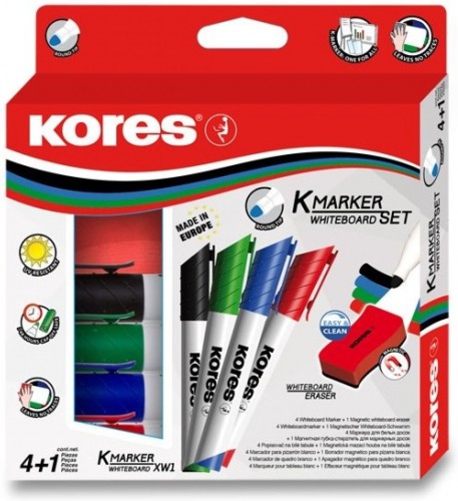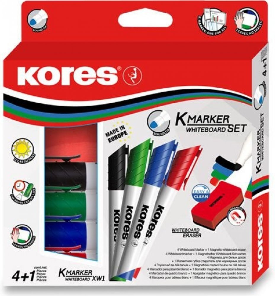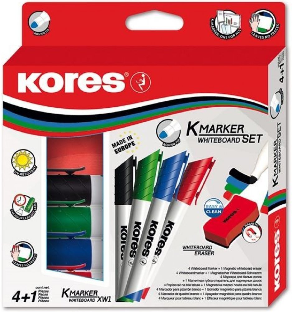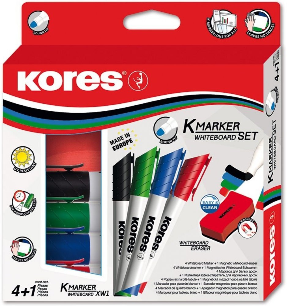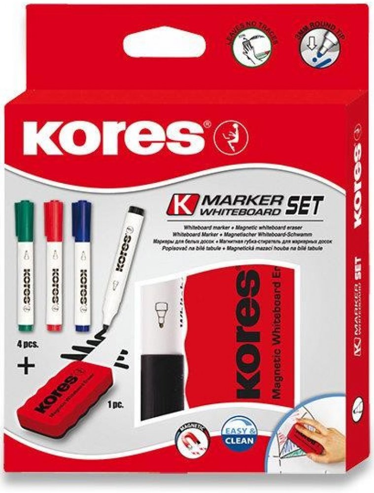 Sada 4 popisovačů K-Marker na bílé tabule a flipcharty v barvách černá, modrá, zelená a červená. Součástí balení je také magnetická stírací houbička s ergonomickým tvarem.