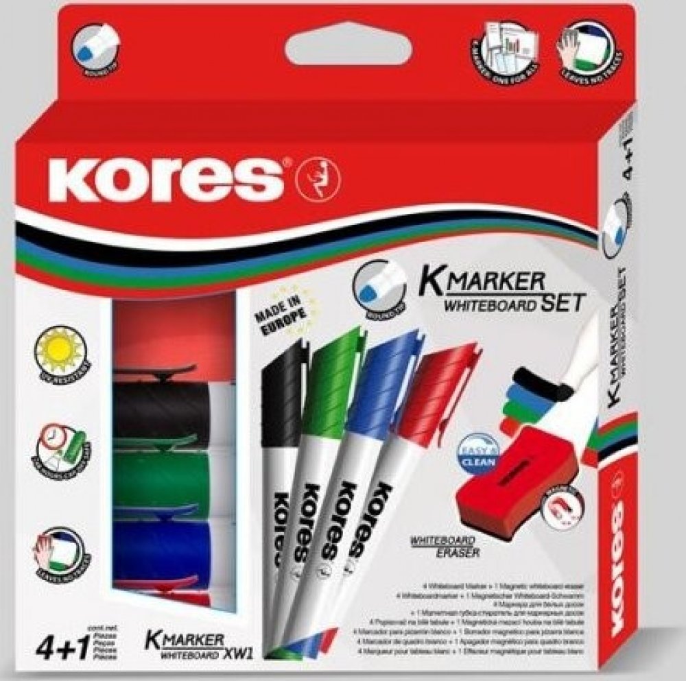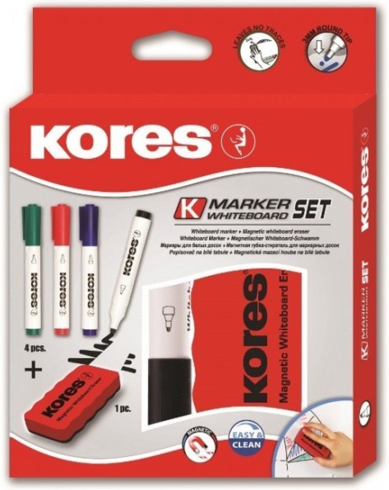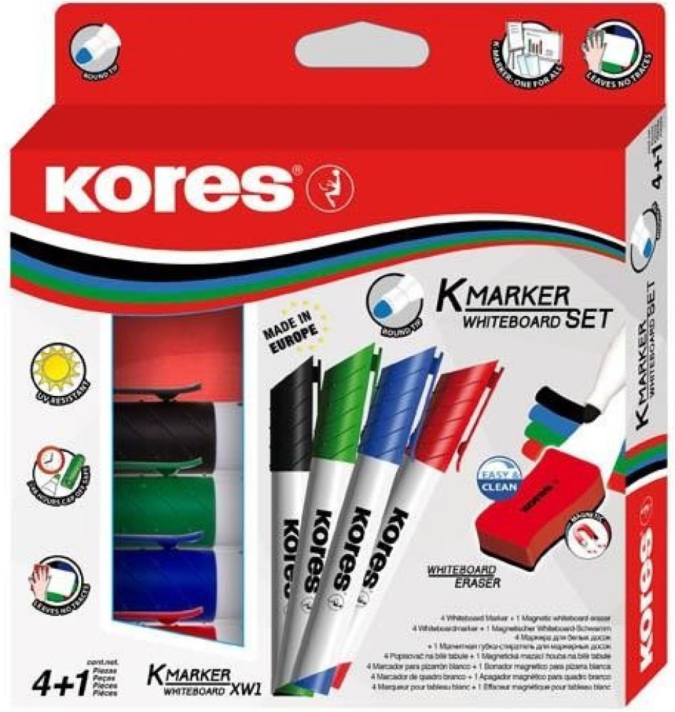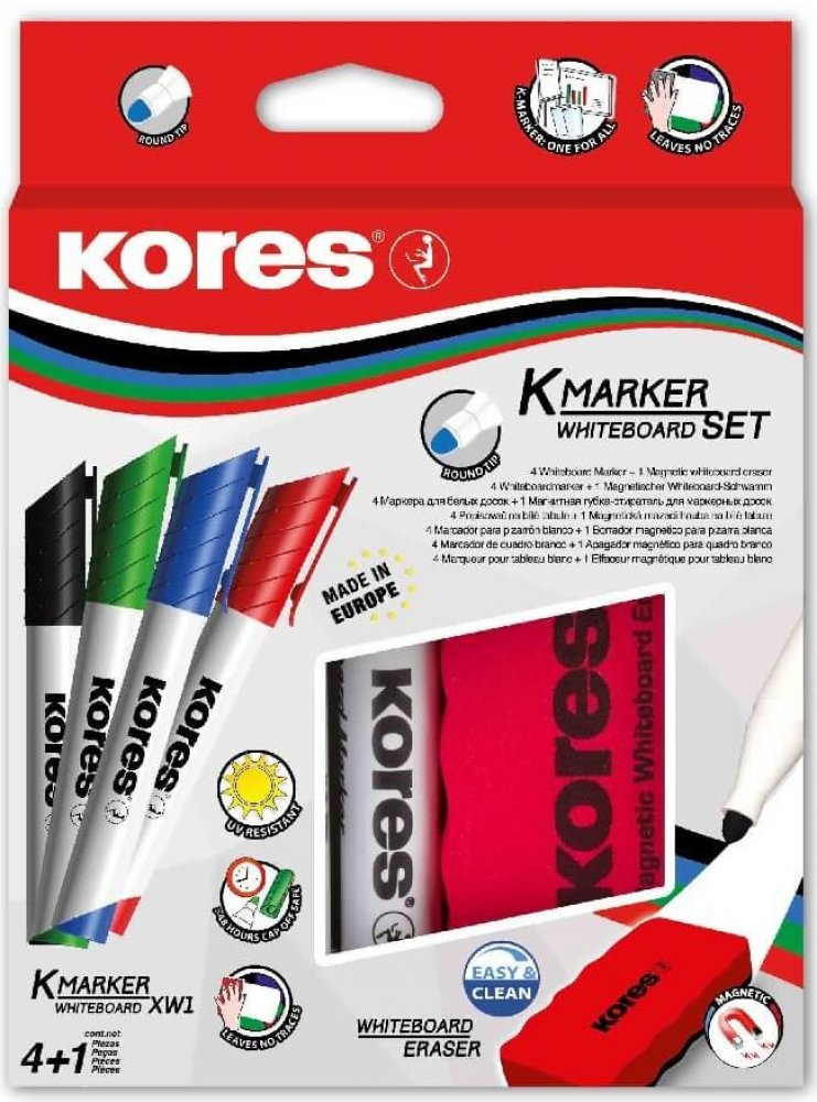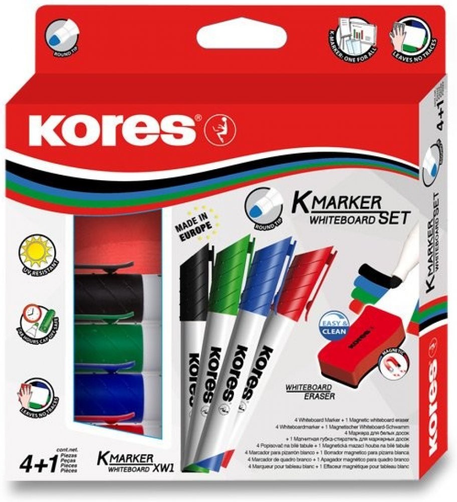 Sada 4 popisovačů K-Marker na bílé tabule a flipcharty v barvách černá, modrá, zelená a červená. Součástí balení je také magnetická stírací houbička s ergonomickým tvarem.