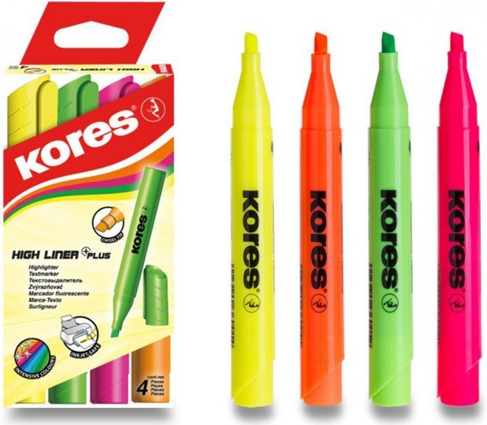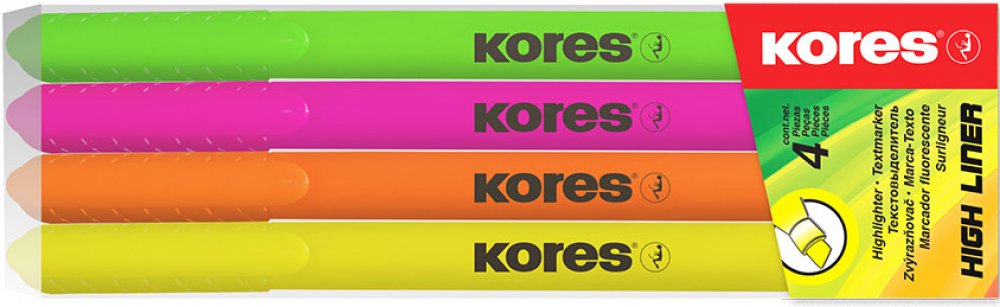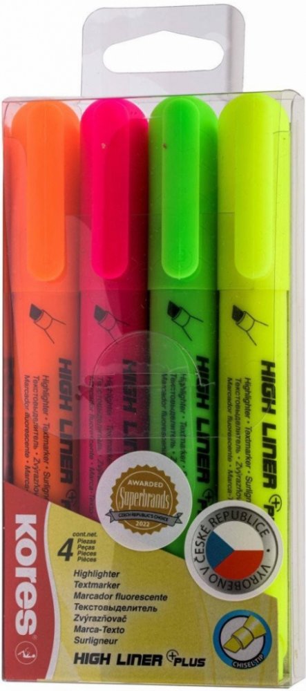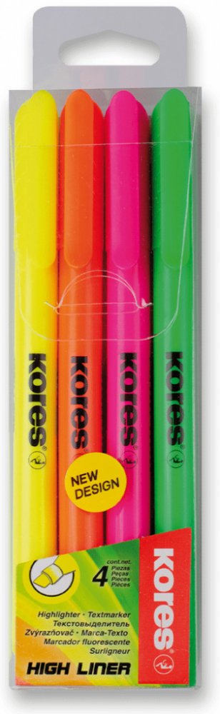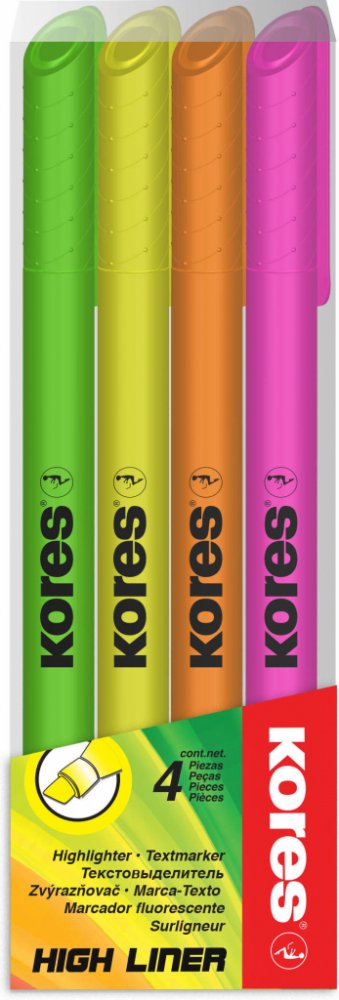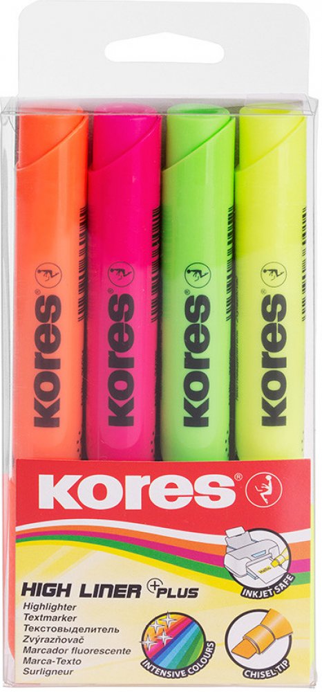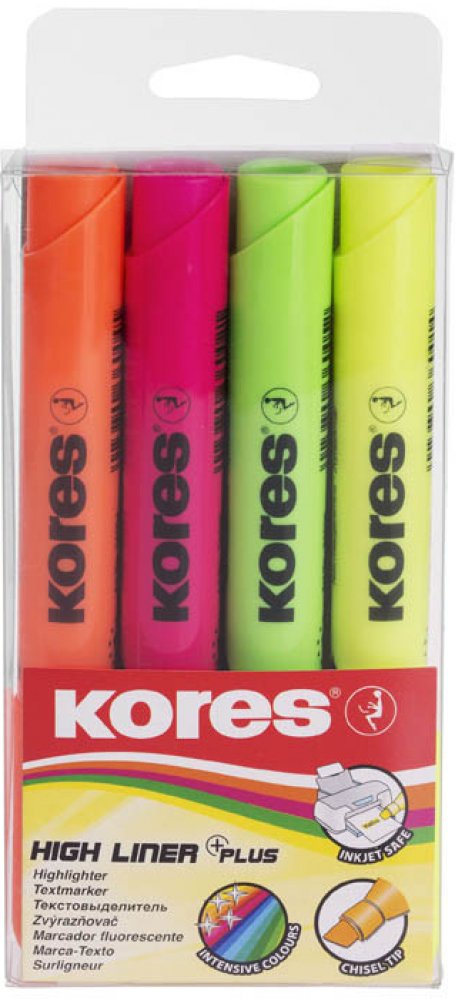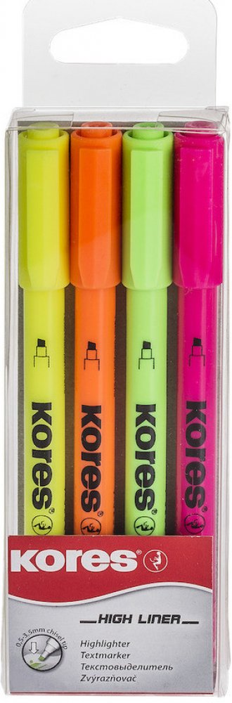 Silný zvýrazňovač vysoké kvality, seříznutý klínový hrot 3 - 5 mm. 4 atraktivní fluorescentní barvy: žlutá, růžová, zelená a oranžová. Inkoust je UV odolný. Univerzální inkoust na vodní bázi pro všechny druhy papíru, kopie, fax i inkoustové výtisky. Vydrží dlouho bez víčka. Více inkoustu pro dlouhou životnost. Sada 4 ks v plastové etui. Cena za balení.
