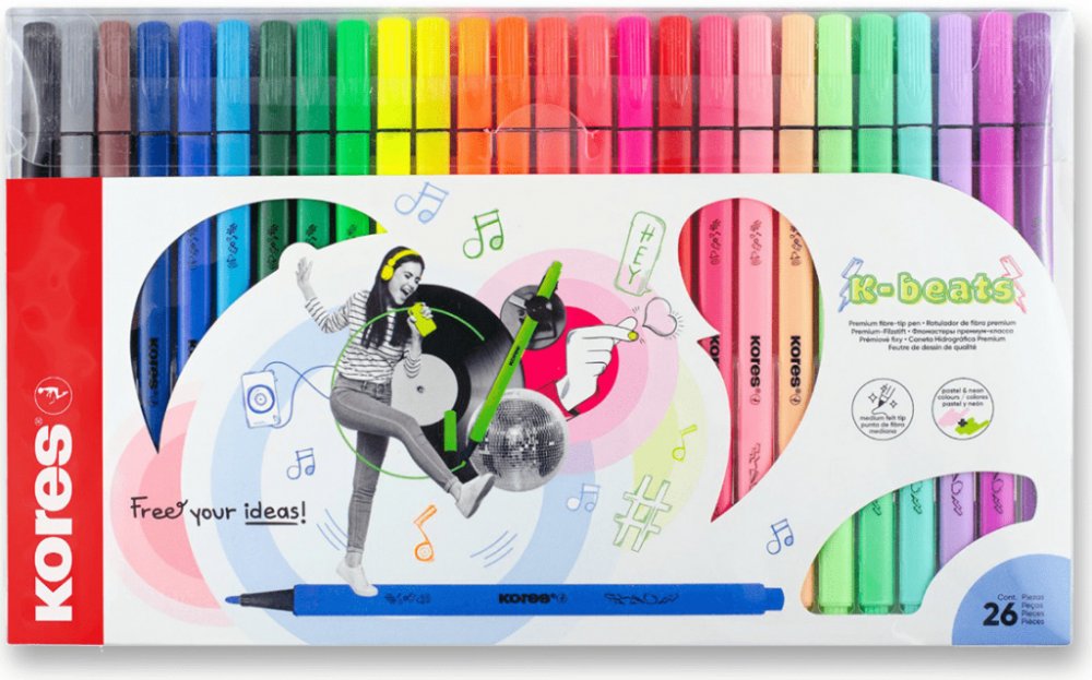 Sada 26 prémiových fixů Kores K-Beats se středním vláknovým hrotem.