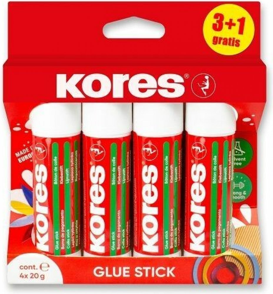 * obsahuje glycerin pro jemné lepení, * vysunovací mechanismus pro snadnou aplikaci, * čistá a hladká aplikace, * vzduchotěsný uzávěr pro dlouhou životnost, * vhodná pro všechny druhy papíru, * lepí trvale za 60 sekund, * neobsahuje rozpouštědla, kyseliny, netoxická, * ideální pro použití doma, v kanceláři i ve škole, * vodou omyvatelné, lehce vypratelné, * vyrobeno v ČR, [Kores symboly]