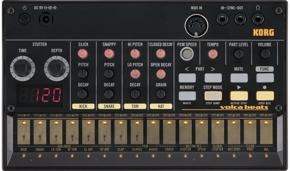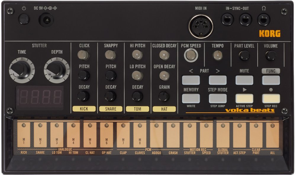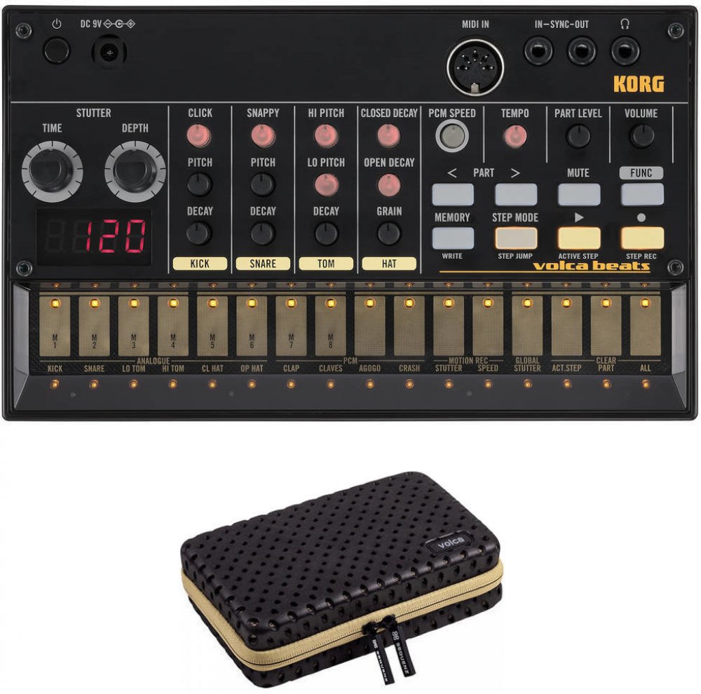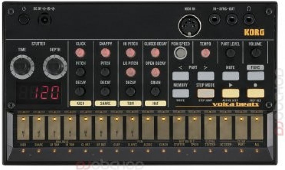 Analogový groovebox Model Volca Beats nabízí vysoce kvalitní analogové bicí, které vycházejí z odkazu klasických rytmických modulů a snadno ovladatelný krokový sekvencer inspirovaný sérií Electribe. Reálné analogové bicíModel volca beats nabízí šest zvuků, u kterých analogová kvalita vynikne nejvíc: Kick, Snare, Hi Tom, Lo Tom, Closed Hi Hat, a Open Hi Hat. Velmi pečlivým přepracováním těchto standardních zvuků, které jsou nepostradatelné pro taneční muziku, Korg dosáhl nových inspirujících zvuků, které nelze generovat jinak než na analogu. Maximální výkon s minimem parametrů – unikátní výhoda analoguU volca beats najdete pečlivě vybranou sadu parametrů, díky kterým můžete okamžitě vytvořit zvuk, jaký chcete. Stačí k tomu například kombinace tří otočných tlačítek Click, Pitch, a Decay. Ať už bude nastavení ovladačů jakékoliv, vždy uslyšíte vysoce kvalitní zvuk, dosažitelný jen a pouze na analogovém zvukovém generátoru. PCM zvukový engine, který doplňuje analogPomocí PCM engine se pokrývají některé zvuky, u kterých by použití analogového systému nebylo vhodné, jako např. u zvuků Clap, Claves, Agogo, a Crash. Veškeré PCM jsou ovšem také v nejvyšší kvalitě. Jejich charakter si pak můžete přizpůsobit změnou nastavení PCM Speed. Loop sekvencer převzatý z ElectribeTento sekvencer je navržen tak, aby editace byla snadná a daly se improvizovaně vkládat nebo odebírat určité části. Za použití 16 kláves tak můžete vkládat jednotlivé tóny, a přitom vizuálně kontrolovat jejich správné načasování v rámci taktu. U každého ze tří oscilátorů můžete vložit zcela jiné fráze, a nahrávat lze v reálném čase. Do paměti lze uložit až osm vzorů (pattern) sekvenceru. Funkce Stutter pro dynamické změny sekvencíPři živých vystoupeních určitě využijete funkci Stutter, která dodá patternům dynamiku a nádech delay efektu. S její pomocí tak můžete úplně změnit původní vyznění nebo ji naopak použít jako přechod při přepínání mezi dvěma paterny. Pohyby tlačítka Stutter se dají také nahrát do sekvence. Funkce Active Step a Step JumpFunkce Active Step umožňuje vynechávat kroky během přehrávání sekvence; naopak funkce Step Jump po stisknutí okamžitě přehraje pouze ten krok, který potřebujete. Jde tedy o efekt podobný zkrácené smyčce, nebo se jím dají tvořit nepravidelné rytmy, což oživí celou sekvenci, jakoby jste ji hráli sami. Díky široké konektivitě si můžete vychutnat přehrávání, vycházející současně z několika syntezátorů volca, anebo je propojit s monotribe. Prostřednictvím iPhonu také můžete bezdrátově kontrolovat tempo a některá další nastavení, včetně playbacku s iOS přes WIST. Přes konektor MIDI IN je možné synchronizovat syntezátor s dalšími zařízeními, anebo „hrát“ na syntezátor přes připojený MIDI keyboard. Obdobně je pak taky možné propojit volca s vaším hudebním software a využít ji v jeho rámci jako zvukový modul. Po analogových syntezátorech monotron, monotribe, a MS-20 Mini, představuje Korg novou sérii volca. Skládá se celkem ze tří modelů: volca keys syntezátor, volca bass neboli basový syntezátor, a volca beats neboli bicí syntezátor. Tyto syntezátory se svými parametry nabízí opravdu zajímavé možnosti hudební tvorby, při které oceníte hlavně široký rozsah hutných zvuků, které se dají vytvořit jedině analogovým zařízením, a dále také smyčkovací sekvencer ke generování unikátních frází. Tyto modely jsou navzájem kompatibilní a můžete je tak používat společně, nebo je propojit s vaším hudebním software. Protože se dají napájet bateriemi a mají vestavěné reproduktory, využijete je kdykoliv a kdekoliv. Vyzkoušejte novou generaci analogových syntezátorů s neopakovatelným zvukem a funkcemi. Dokonce i dnes, více než třicet let poté kdy hudební scéně dominovaly právě analogové syntezátory, nemůžeme analogové bicí automaty opomenout. Jejich osobitý zvuk, tak výrazný vedle kytary a akustických bicích, je stále nepostradatelný při nahrávání a živých vystoupeních. Protiprachový kryt pro Korg Volca Beats: {1}