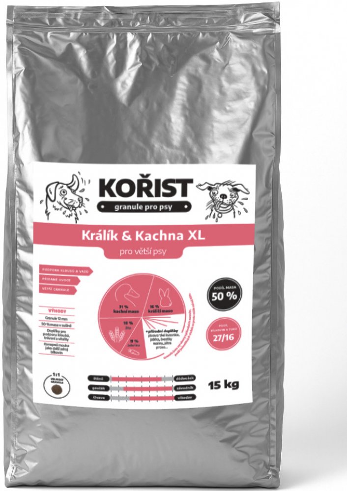 Granule Kořist – Králík & Kachna XL jsou navržené přesně pro potřeby větších plemen: obsahují větší velikost granulí pro pohodlné kousání, vysoký podíl kvalitního masa a speciálně vybrané přírodní složky pro podporu kloubů, imunity i trávení.
