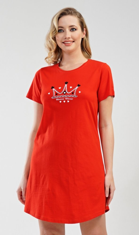 Dámská bavlněná noční košile s krátkým rukávem Koruna. Noční košile má na hrudi obrázek koruny doplněný karetními symboly s nápisem 'Always Winner'. Použitý bavlněný materiál je příjemný a poddajný na dotek.
