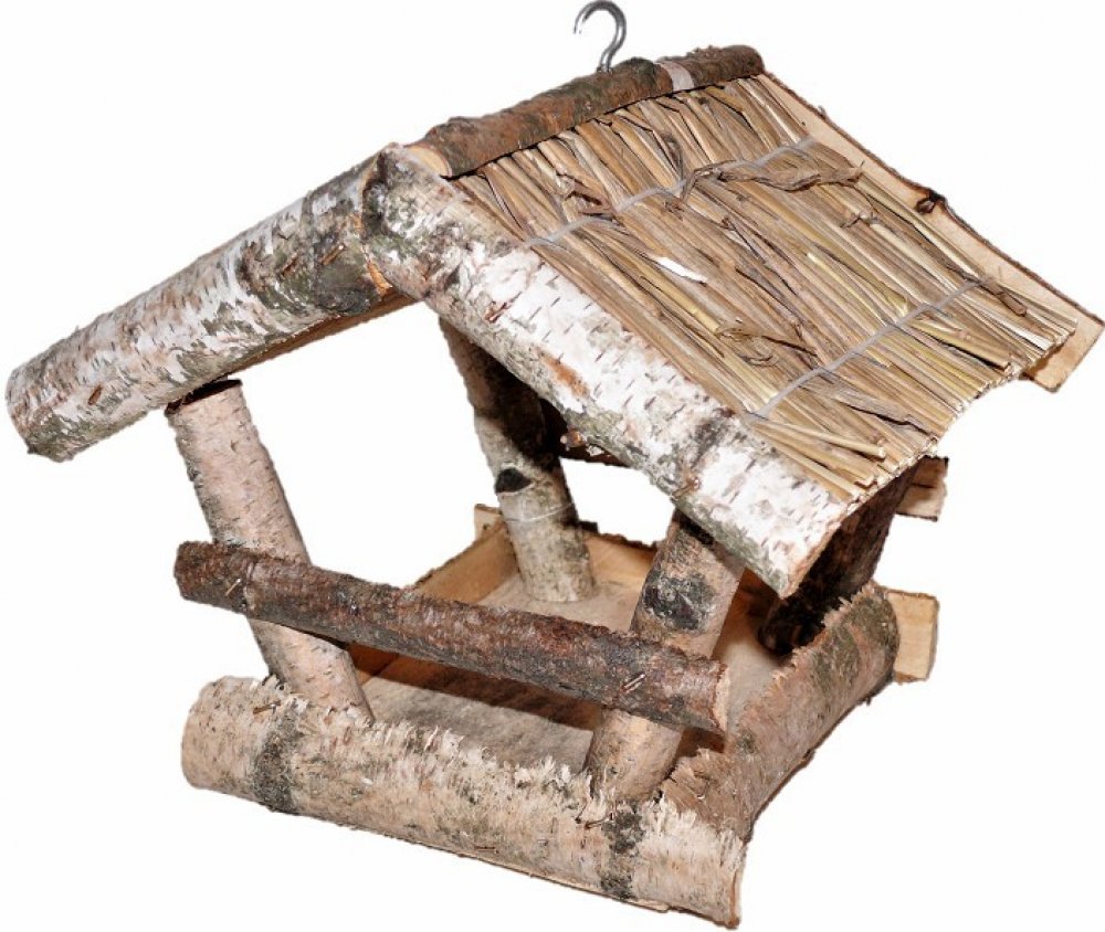 Středně velké krmítko pro menší druhy ptáků - především sýkorky a kosy, vyrobené z březové kulatiny, kryté slaměnou stříškou. Snadno ho zavěsíme na větev stromu za drátěné očko.