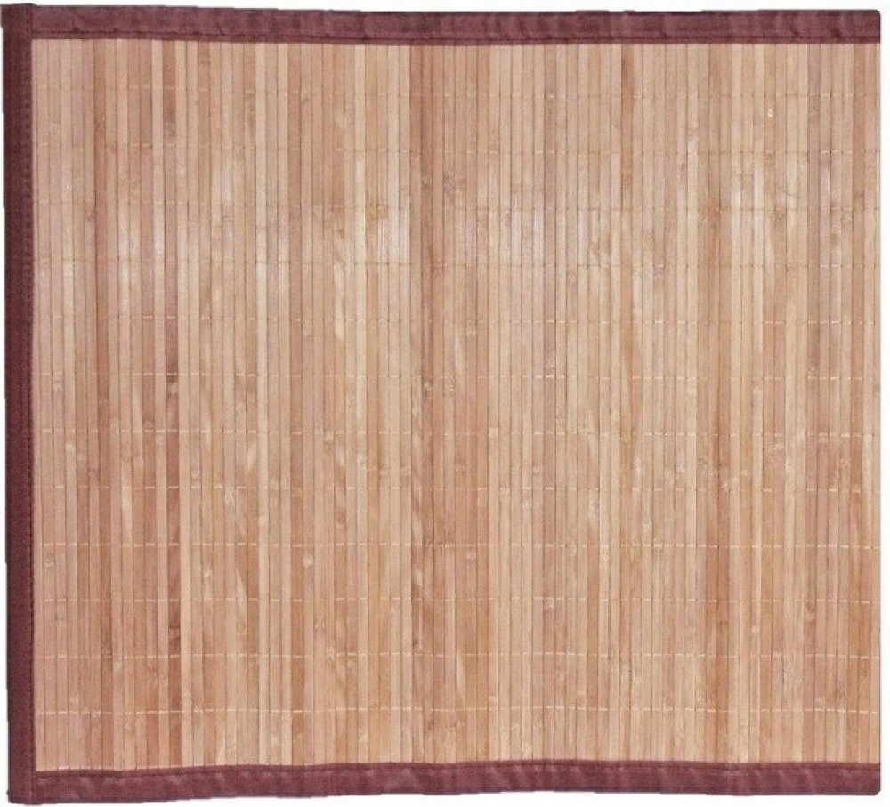 Obdélníková rohož vyrobená z bambusu, obšitá látkou. Spodní strana rohože je polepena textilií s protiskluzovou úpravou. Barva hnědá.