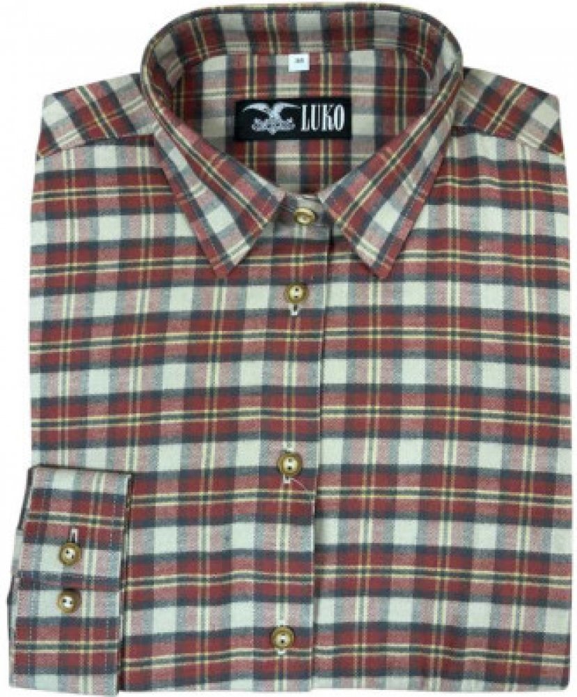 Dámská košile s dlouhým rukávem z oboustranně česaného flanelu s keprovou vazbou. Střih je vypasovaný se spodní obrubou do oblouku. Halenka má prsní záševky a díky tomu daleko lépe sedí.Myslivecké knoflíky. (na foto jiné knoflíky)