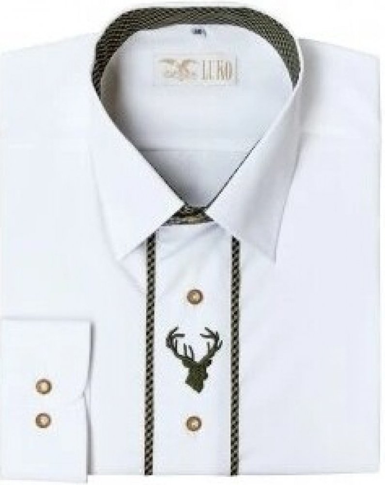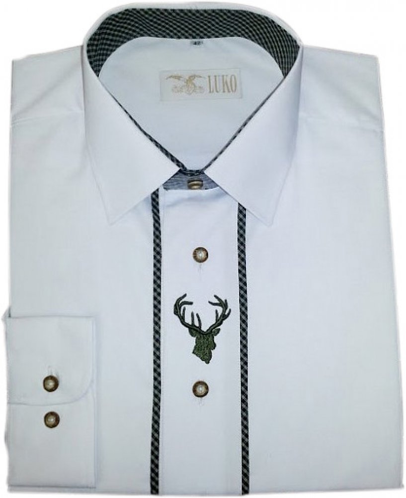 Elegantní bílá pánská košile s dlouhým rukávem ze směsového materiálu 60% bavlna/40% polyester. Košile je obohacena o ozdobné aplikace z kontrastního materiálu, které se barevně doplňují s výšivkou jelena. Knoflíky jsou z imitace paroží (plast, stálobarevné, vysoce odolné).
