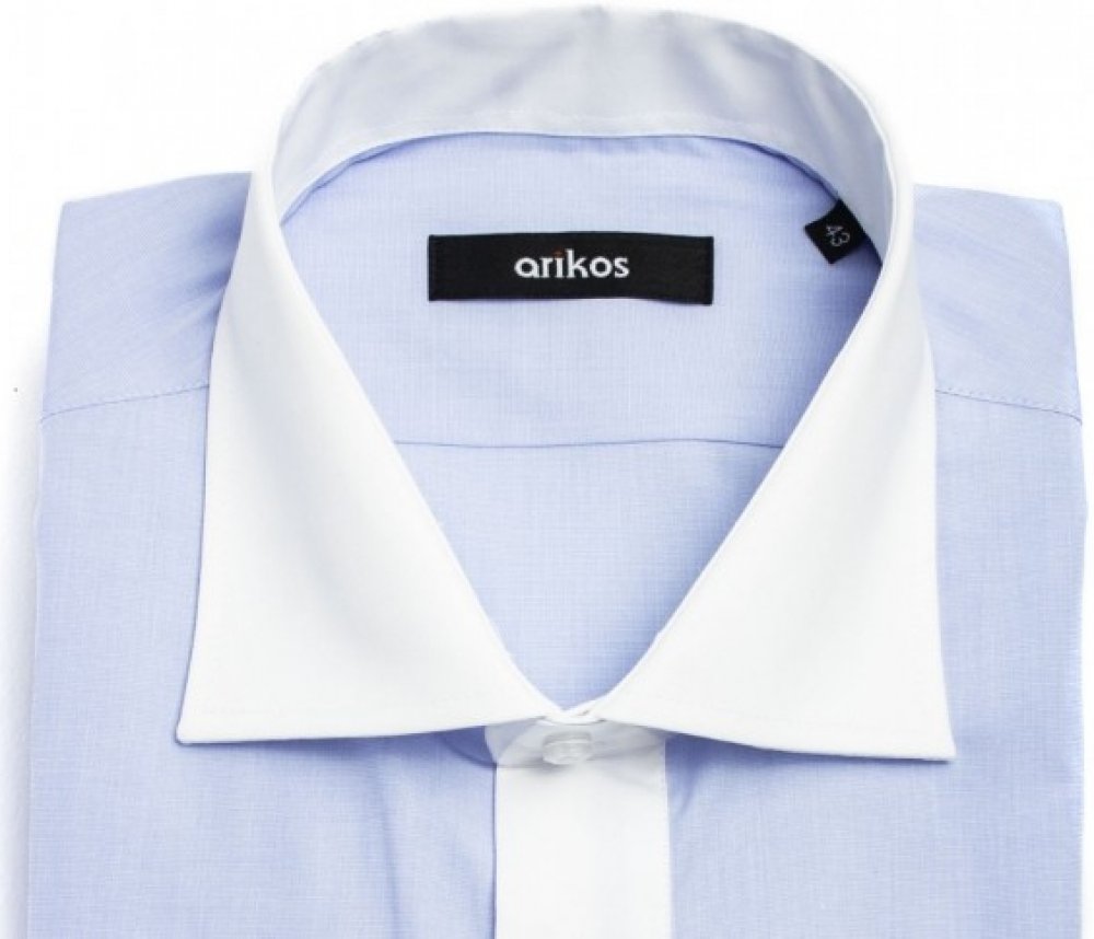 - Světle modrá pánská košile na manžetové knoflíčky s bílým límcem, légou a manžetami. Široký francouzský límec se hodí jak ke kravatě, tak nošení bez ní. Košile je vyrobena ze 100% bavlny s žehlivou úpravou a je bez kapsy.
