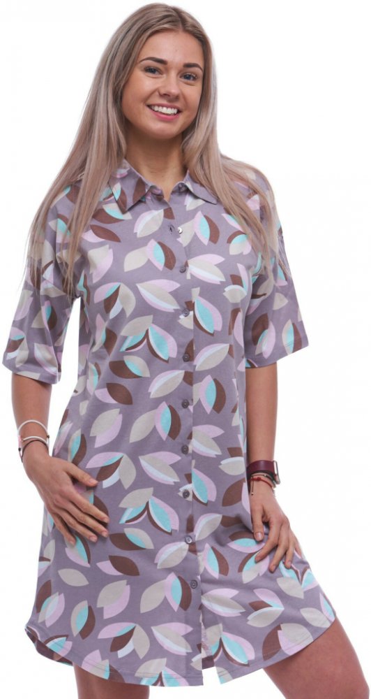 Elegantní košilka s límečkem a krátkým rukávem je celopropínací na knoflíky, což jí dodává moderní a praktický vzhled. Krásný celovzor a střih s délkou nad kolena podtrhují ženskou siluetu a přinášejí nádech luxusu do každého dne.