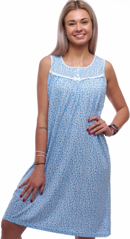 Dámská noční košilka bez rukávů s květinovým vzorem – modrá, zapínání na dva knoflíky u krku – ideální kombinace pohodlí a elegance. Vyrobena z jemného materiálu ze 100% bavlny, který je prodyšný a měkký na dotek, zajišťující maximální komfort během spánku. Kvalitní zpracování zaručuje dlouhou životnost i po opakovaném praní. Originální design přináší stylový vzhled, který ocení každá žena. Skvělá volba pro ty, kteří hledají komfortní a vkusné noční prádlo.