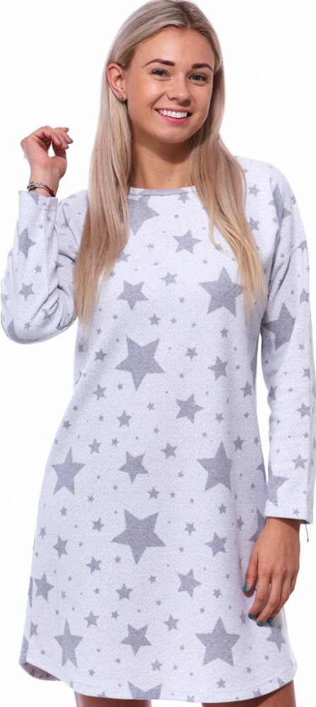 Dámská noční košilka s dlouhým rukávem ve světle šedé barvě s celoplošným vzorem tmavších šedých hvězdiček je ideální volbou pro ženy a dívky, které chtějí spojit pohodlí s jemným a moderním designem. Příjemný střih lichotí postavě a poskytuje dostatek komfortu i ve větších velikostech.