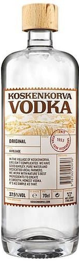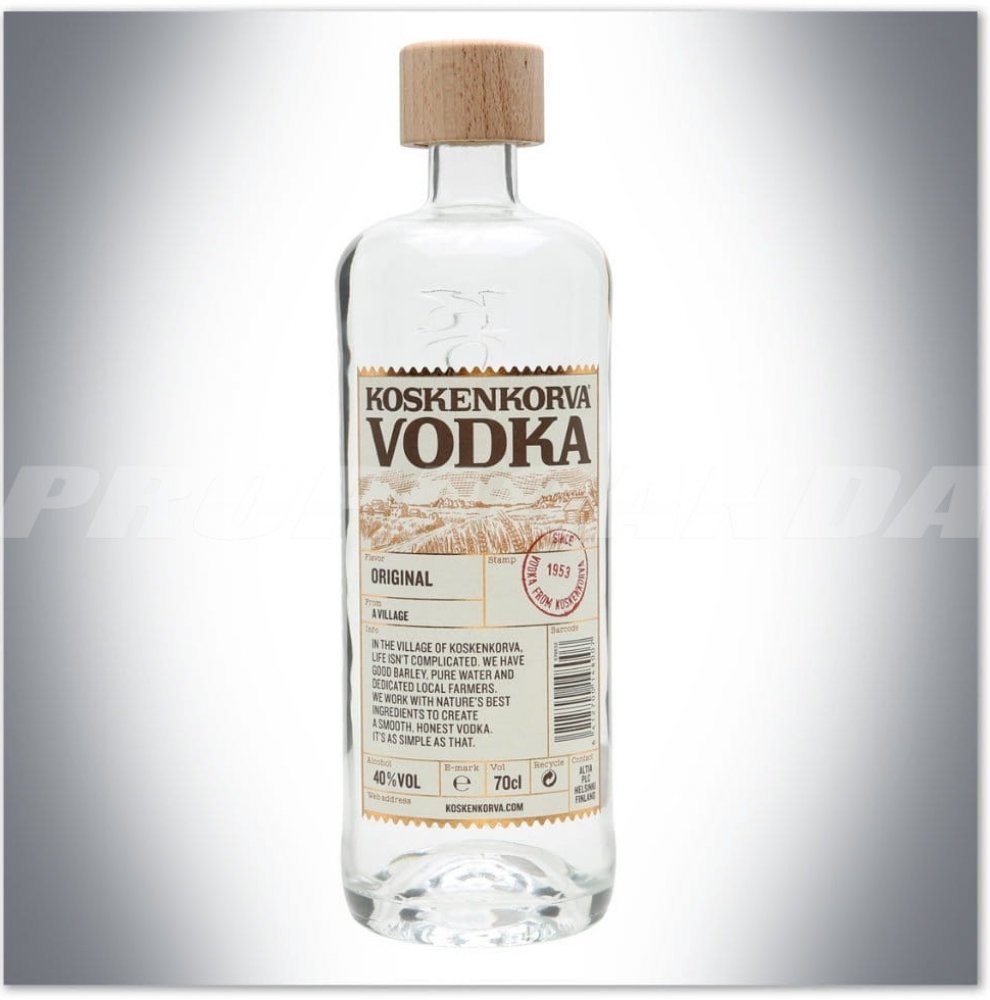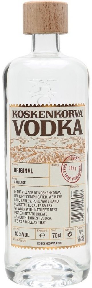Koskenkorva Vodka 0,7 l - Nejoblíbenější vodka ve Finsku. Jako všechny pravověrné vodky má i Koskenkorva svůj základ v přírodních ingrediencích. Vyrábí se více než 500 násobnou destilací. Destilát z nejlepších odrůd ječmene doplňuje pouze čistá ledovcová voda.