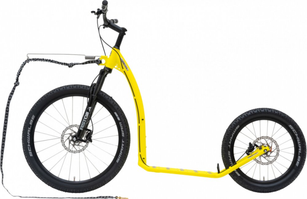 KOSTKA Mushing Max (G6) je terénní musherská koloběžka s koly 26×20" a odpruženou vidlicí, ideální pro jízdu v náročném terénu. Má zesílenou a rozšířenou nášlapnou plochu pro větší stabilitu, hliníkový doraz paty a semiintegrované hlavové složení. Pláště Schwalbe Smart Sam poskytují skvělou přilnavost, zatímco hydraulické brzdy Shimano zajišťují bezpečné zastavení. Součástí výbavy je adaptér vodít...