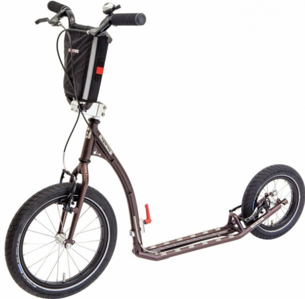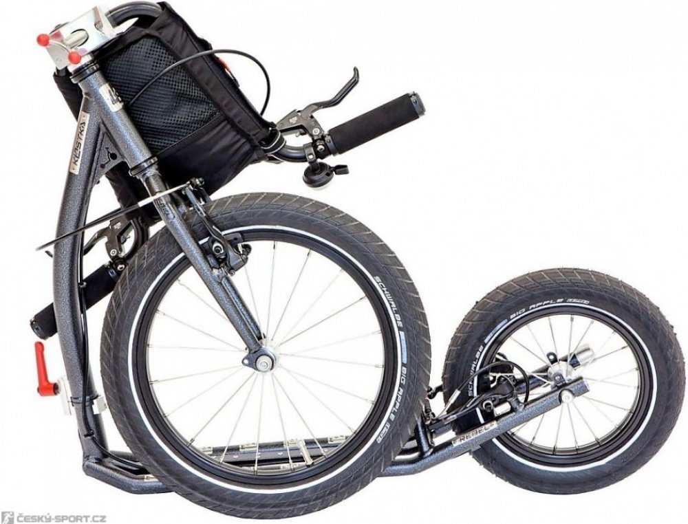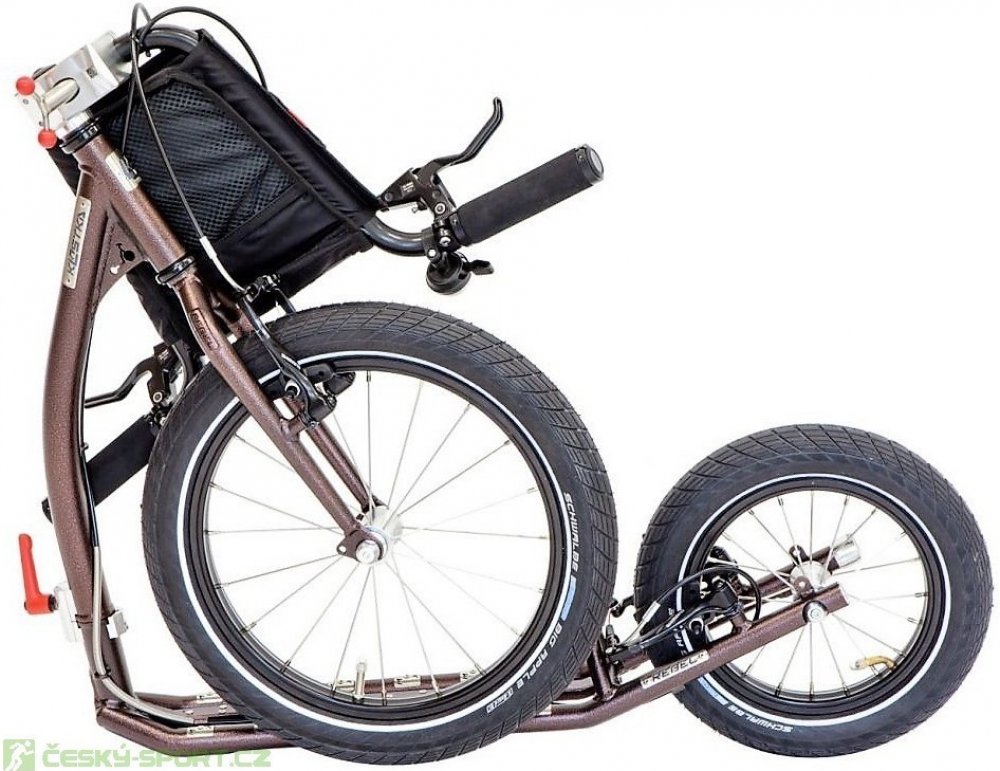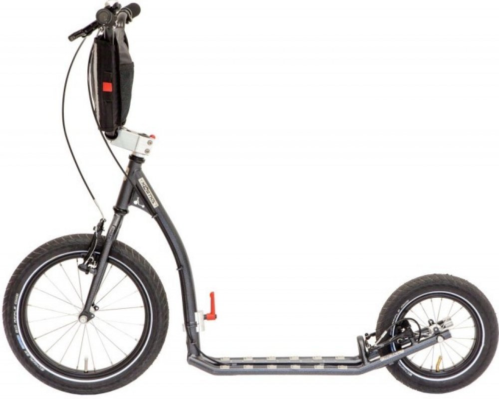 Tato lehká koloběžka s nafukovacími koly se vyznačuje vynikajícími jízdními vlastnostmi, které z ní dělají nespoutaného uličníka (za jejími řidítky se ulicemi budete řítit vždy hravě a bez omezení). Dravou jízdu zajistí náboje Kostka HK 6524 RS na průmyslových ložiscích, odolnost koloběžky zase zaručuje rám z vysokopevnostní (CrMo) oceli, jenž je ze spodní strany nášlapu chráněn speciálními sváry a výztuhou. Tyto prvky nejenže rám chrání proti opotřebení, ale současně zvyšují jeho tuhost. Malá kola koloběžky (16"/12") s ráfky RMX 2021, obutými do kvalitních plášťů Schwalbe Big Apple, se zase postarají o nesmírnou obratnost a pohodlnost. Když se v cestě nečekaně objeví chodec, auto, tramvaj, splašený pes nebo díra v chodníku, vždy spolehlivě zastavíte díky véčkovým brzdám Shimano 4000.
