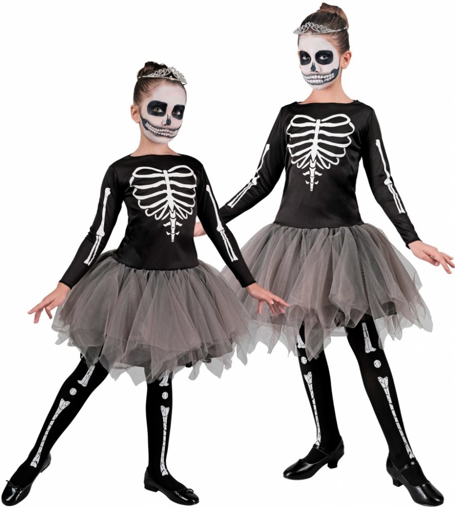 Dětský kostým kostlivce je netradiční, protože tentokrát se jedná o hosta ze záhrobí, který se stal balerínou. Dávku strašidelnosti dává převleku triko s potiskem kostí a jemnost mu přinese tutu sukně.