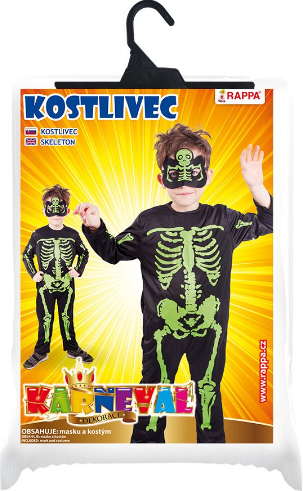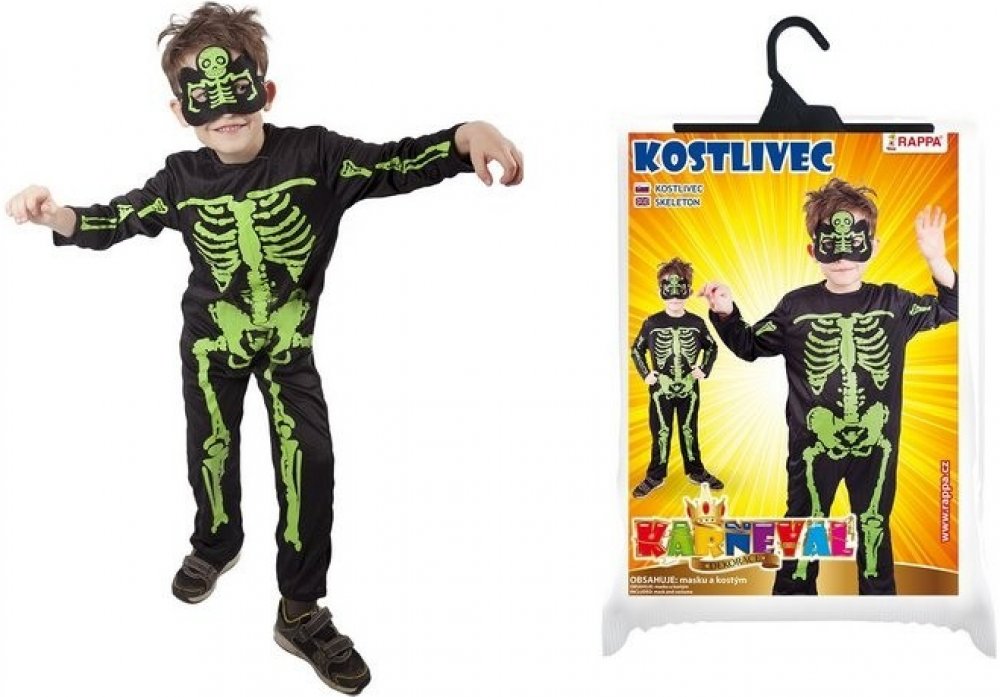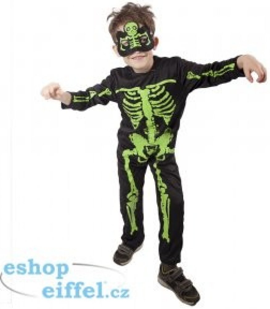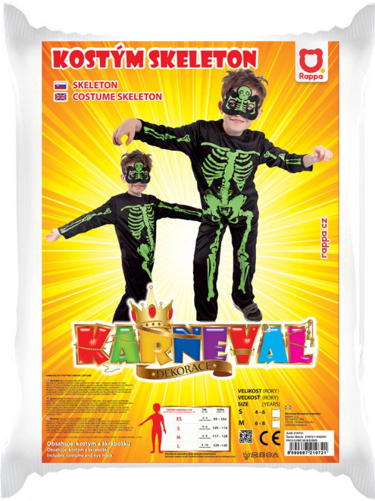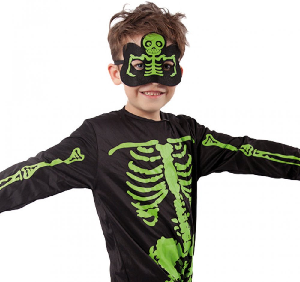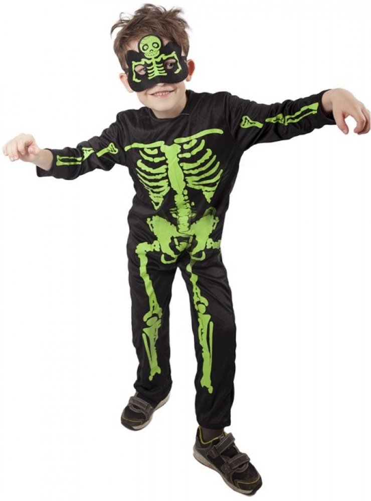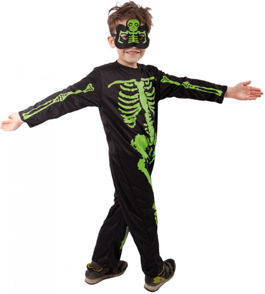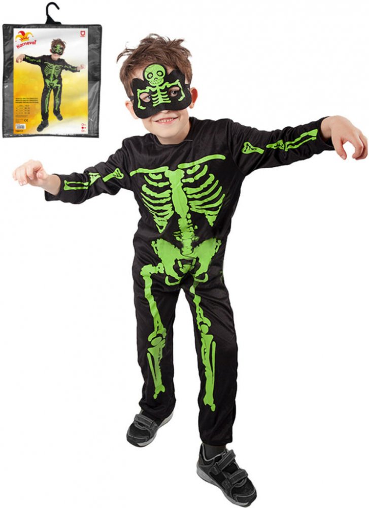 Strašidelný karnevalový kostým s motivem kostlivce! Kostým ve velikosti S je určen pro chlapečky ve věkovém rozmezí 4-6 let. Balení obsahuje černou kombinézu a masku s motivem zeleného kostlivce.