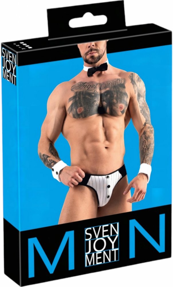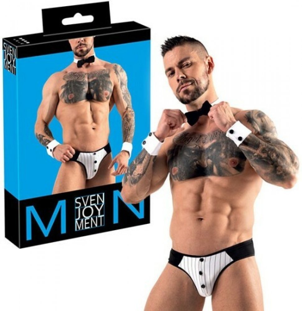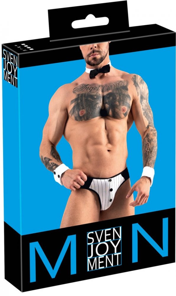 Tato sexy souprava Svenjoyment Gentleman ve stylu kostýmu číšníka okoření vaše role play či submisivní hry a naladí pikantní a intimní atmosféru. Sada obsahuje černobílé slipy, motýlka na krk a náramky na zápěstí připomínající lemy rukávů společenské košile.