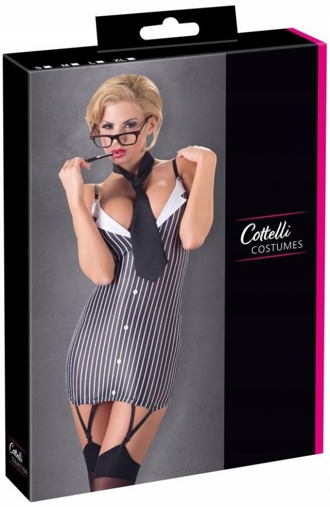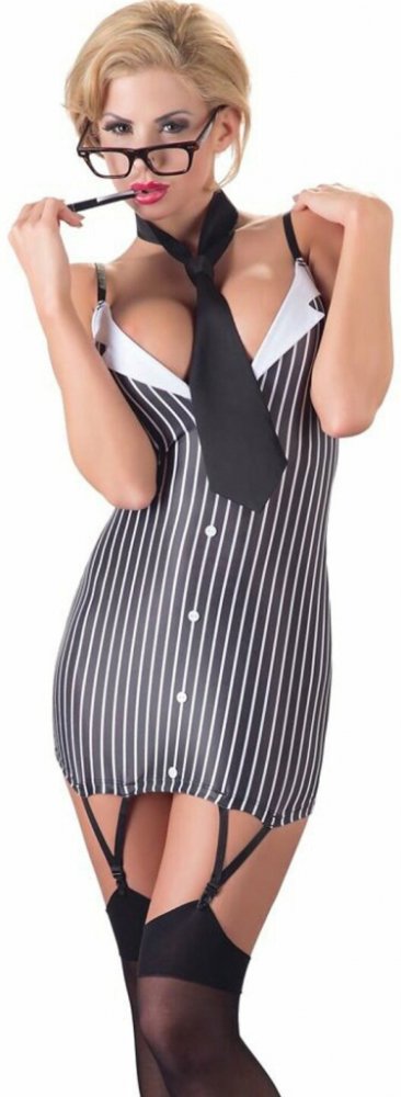 Svůdný kostýmek sekretářky z kolekce Cottelli Collection představuje přilnavé, pruhované mini šaty s nastavitelnými ramínky a dvěma popruhy k upevnění punčoch. Šatičky jsou doplněné o kravatu. Chlapi z vás budou šílet a neodtrhnou od vás oči. Je dost možné, že po jednom dni v našem kostýmu sekretářky budete chtít dělat jedině tuto práci!