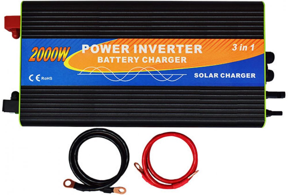 Měnič napětí značky KOSUN 2000W, 12V (DC) s čistou sinusoidou, má integrovanou nabíječku (nabíjecí proud až 30A), USB výstup (s napětím 5V, proudem 2.1A) pro nabíjení různých zařízení a MPPT solární regulátor pro připojení solárních panelů ( max. napětí 70V). Přístroj disponuje také funkcí UPS (automatické přepínání sítě a baterie při výpadku napájení) a ECO (pro úsporu energie, prioritní zdroj en...