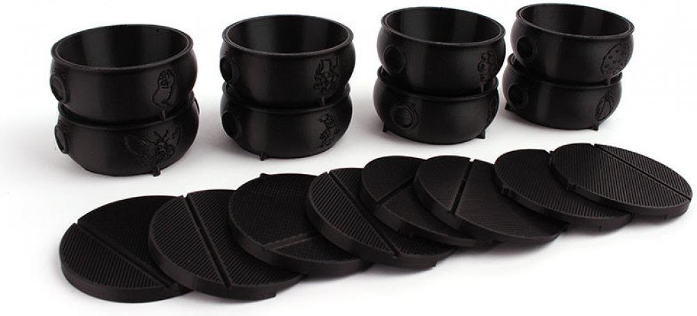 Tématické kotlíky s odpovídajícím symbolem na žetony ingrediencí pro hru Kvedlalové z Kvedlinburku. Kotlíky jsou kombinovatelné s víčky a ohni. Víčka slouží k uzavření a skladování žetonků přímo v kotlíku v krabici, a navíc i jako stojánek na destičky knih.