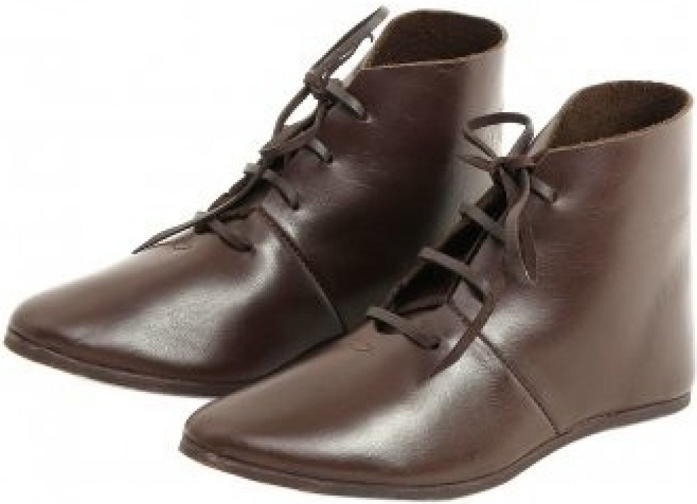 Kotníkové šněrovací boty Středověk, divadelní obuv Tyto boty odpovídají současným velikostním tabulkám. Přes prsty jsou ale poměrně úzké. Kdo má širší nárt či má radši volnější obuv, ten ať objedná o jedno číslo vyšší velikost. Materiál: hovězí useň barvená přírodním rostlinným mořidlem Pevná svrchní kůže o síle cca 2 mm Podrážka o síle 4-5 mm je pobitá hřeby, což prodlužuje životnost podrážky Výška: po kotníky Barva: tmavě hnědá Upozornění: Jedná se o repliku středověkých bot, která se v žádném ohledu nemůže rovnat moderní obuvi. Na mysli máme zejména pohodlí při nošení a celkovou odolnost boty. Pohodlí Vám může zvýšit použití vnitřních vložek a silnějších ponožek. Odolnost boty odpovídá divadelnímu použití v interiéru. Tyto boty nejsou vhodné na pochody venku, historický šerm, či jiné použití, při kterém dochází k oděru podešve. Vhodné je použití např. pro statisty / kompars, kteří v botách jen stojí či jen krátce popocházejí. Pokud boty takto „aktivně“ použijete, dojde k jejich jejímu brzkému opotřebení. Toto nebudeme považovat za důvod k reklamaci – jedná se o přirozenou vlastnost tohoto artiklu, kterou tímto v rámci této nabídky deklarujeme! Jedná se o kvalitní výrobek značky ULFBERTH®.
