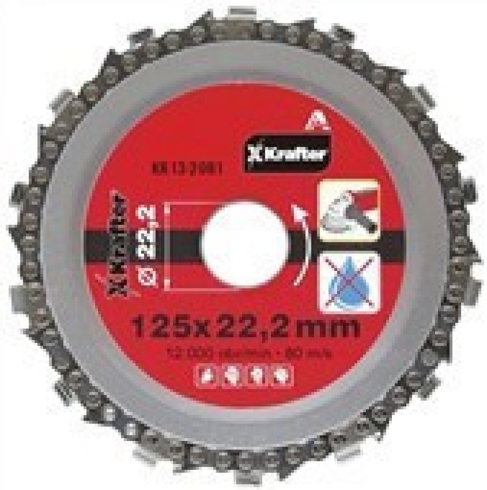 Kotouč pilový řetězový na dřevo 115mm a 125mm.Průměr otvoru : 22mm Kotouč má bezpečnostní pojistku při zaseknutí v materiálu. Nosný střed je vyroben z ocelového plechu, jehož obvod je opásán klasickým řetězem obdobným, který používá klasická motorová řetězová pila.