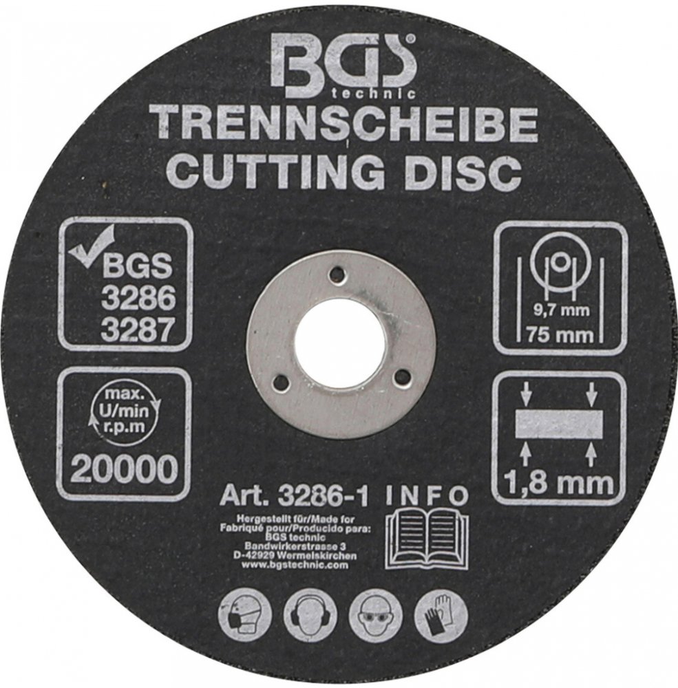 Řezný kotouč, průměr 75 mm (3”), pro využití s pneumatickou přímou bruskou – BGS 3286-1 Kotouč menšího rozměru pro řezání kovu a plechu je vhodný pro drobné úpravy plechu, zařezávání drobných předmětů apod. Technické údaje: Průměr kotouče: 75 mm (3”) Tloušťka kotouče: 1,8 mm Maximální otáčky: 20 000 ot./min. Průměr upínacího otvoru: 9,7 mm