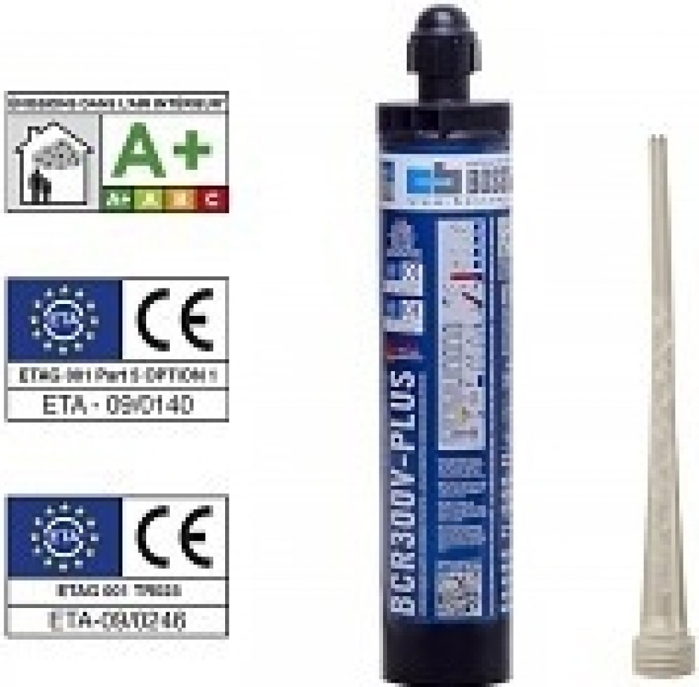 Bossong BCR 300 V-PLUS SF 400ml je velmi kvalitní chemická kotva do vlhka pro vysoká zatížení na bázi vinylesterové pryskyřice bez styrénu, CE OPTION 7 pro beton bez prasklin a CE OPTION 1 pro beton s prasklinami. Schválena pro použití do suchých a vlhkých betonových otvorů. Certifikována pro použití spolu se závitovými tyčemi třídy 5,5, 8,8 a třídy z nerezové oceli. Vhodná i pro použití na dřevo. Poskytuje bezpečnostní upevnění a vysoké zátěžové hodnoty na pevné a duté stavební materiály.
