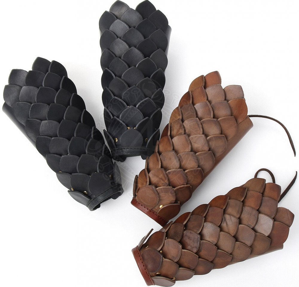 Nátepníky z kožených šupin Drak Specifikace výrobku: vyrobeno z hovězí usně 2,5mm - cca síla použité kůže Barva na přání: černá, hnědá, přírodní rozměr rozloženého nátepníku: délka 24cm, šíře 17 a 27cm Hmotnost jednoho páru cca 420 g Dodávka obsahuje jeden pár (2 kusy) nátepníků dle uvedených fotografií.