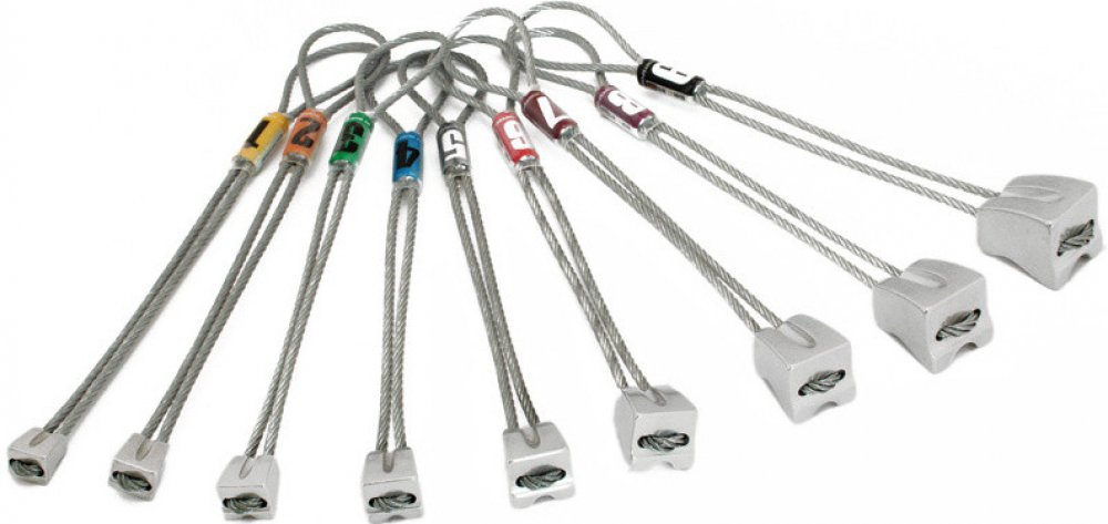Sada 5 ks asymetrických (zkosených) vklíněnců Kouba VECTOR s pevnostním ocelovým lankem. Zkosený tvar umožňuje založení vklíněnce do různých typů spár. Vhodné pro spáru velikosti 11-29mm . Barevný elox pro snadné rozlišení vklíněnců.