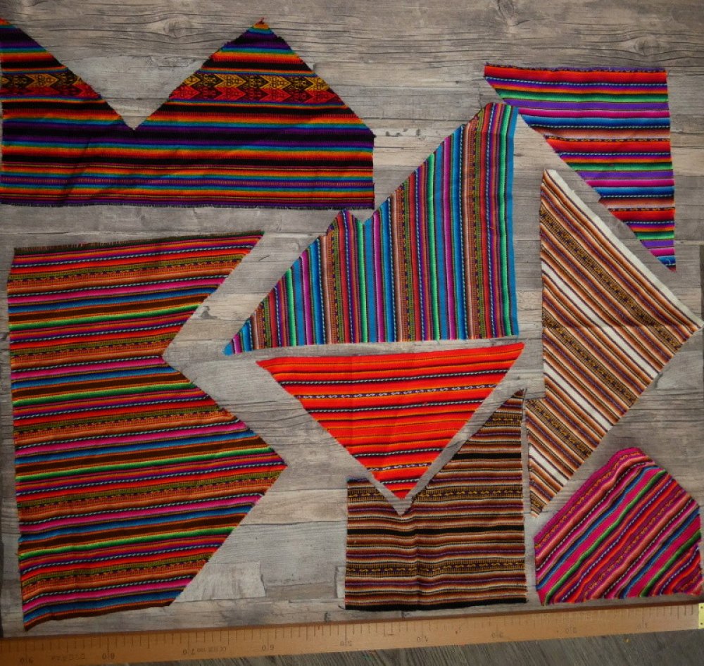 Odstřižky peruánských látek, 8 ks, vhodné na drobné ozdoby nebo doplňky.