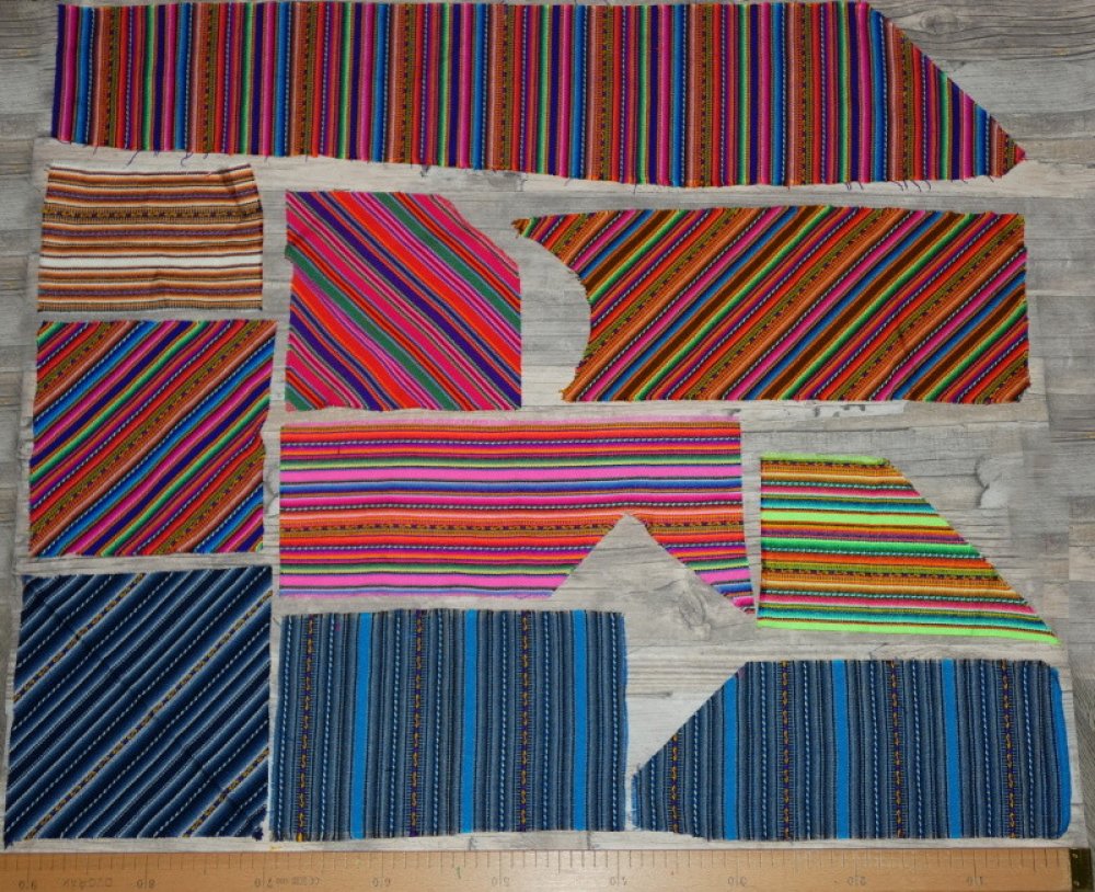 Odstřižky peruánských látek,10 ks, vhodné na drobné ozdoby nebo doplňky.