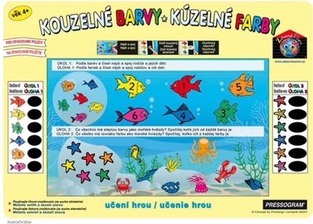 Tabulka s kouzelným inkoustem umožní dítěti hravou formou (učení hrou) procvičit barvy a čísla. Je určena pro opakované použítí a je oboustranná. Má stíratelný povrch, můžete setřít a psát znovu. Správný výsledek se zobrazí zahřáním černého pole. Použijte lihové značkovače (za sucha stíratelné). Na tabulce najdete několik úkolů, výsledek nebo správná odpověď je skryta pod černým polem. Rozměr: 245...