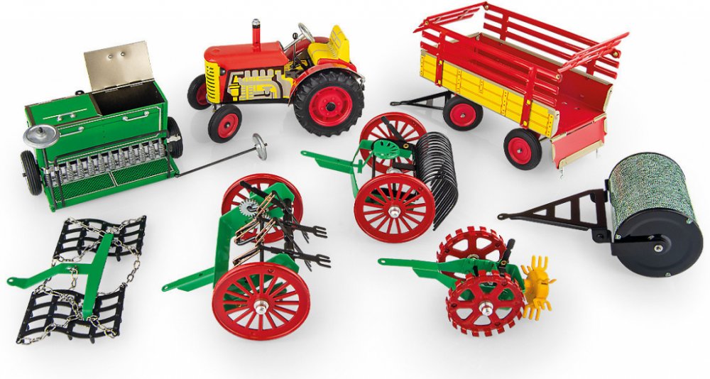 Tradiční plechové hračky z výrobní řady veteránů zemědělských strojů