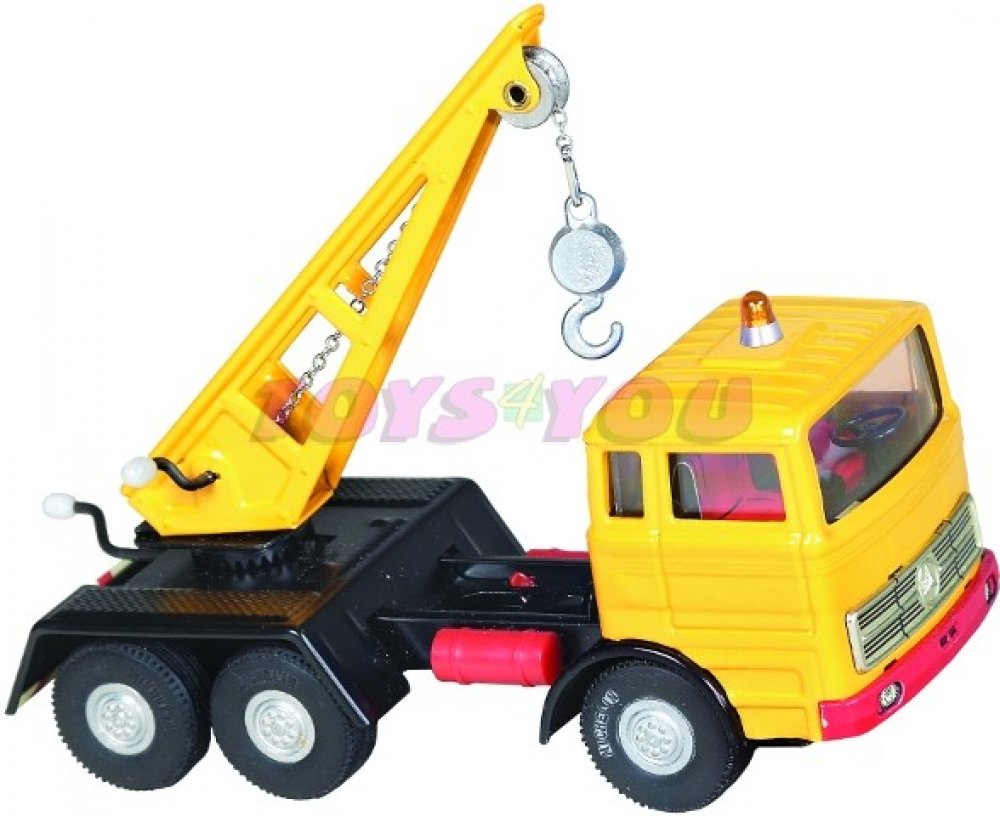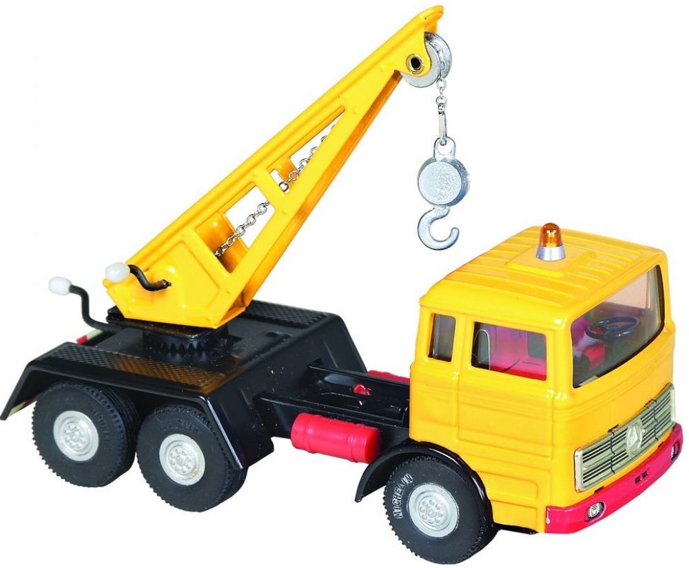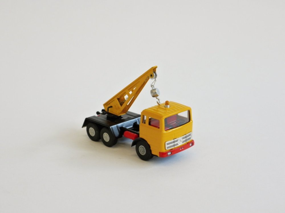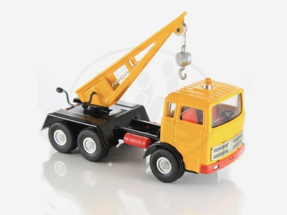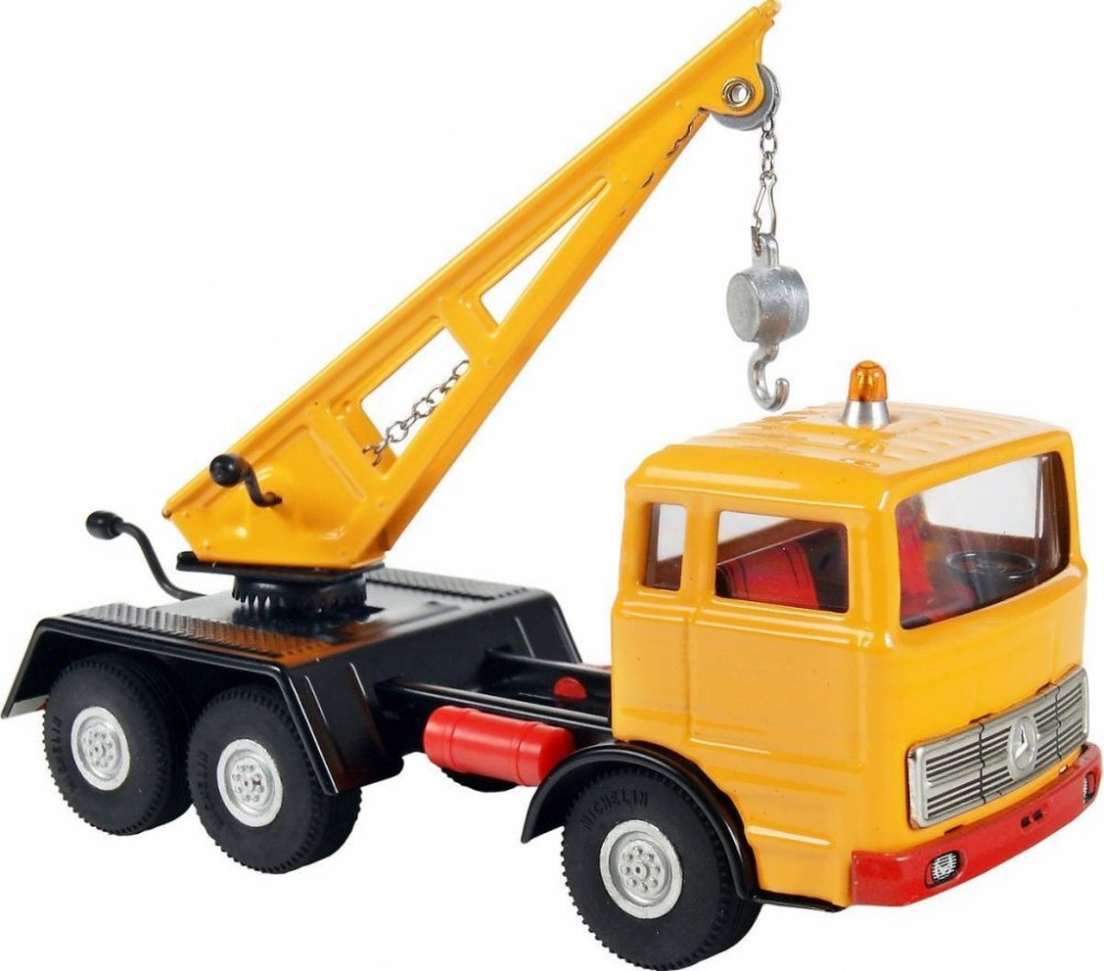 Kovový model jeřábu Mercedes s navijákem a hákem.
