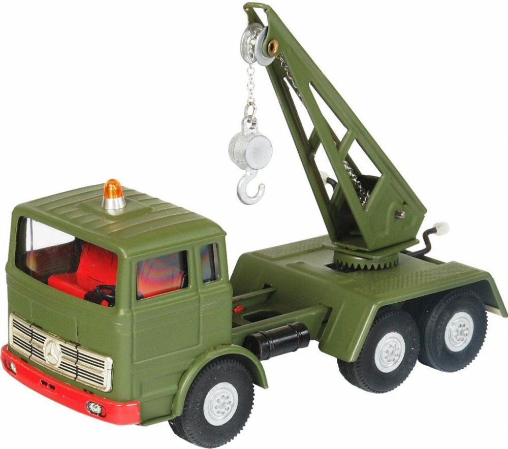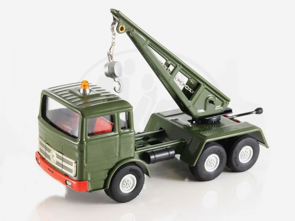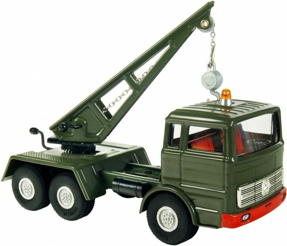 Kvalitně zpracovaný kovový model vojenského vozu Mercedes s jeřábem, navijákem a hákem.