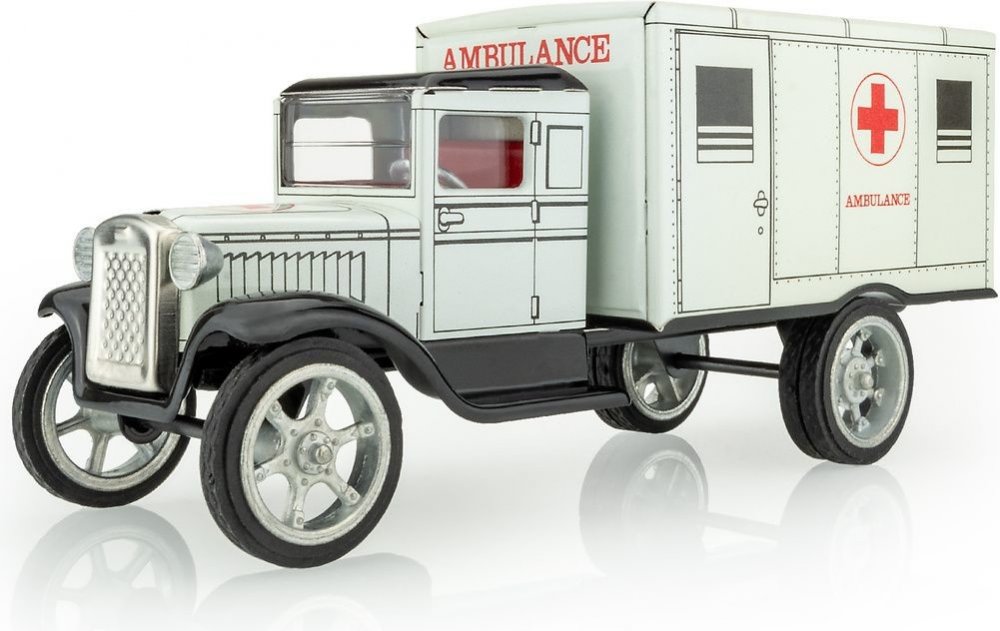 Model vojenské Hawkeye retro ambulance vyrobené z potištěného plechu.