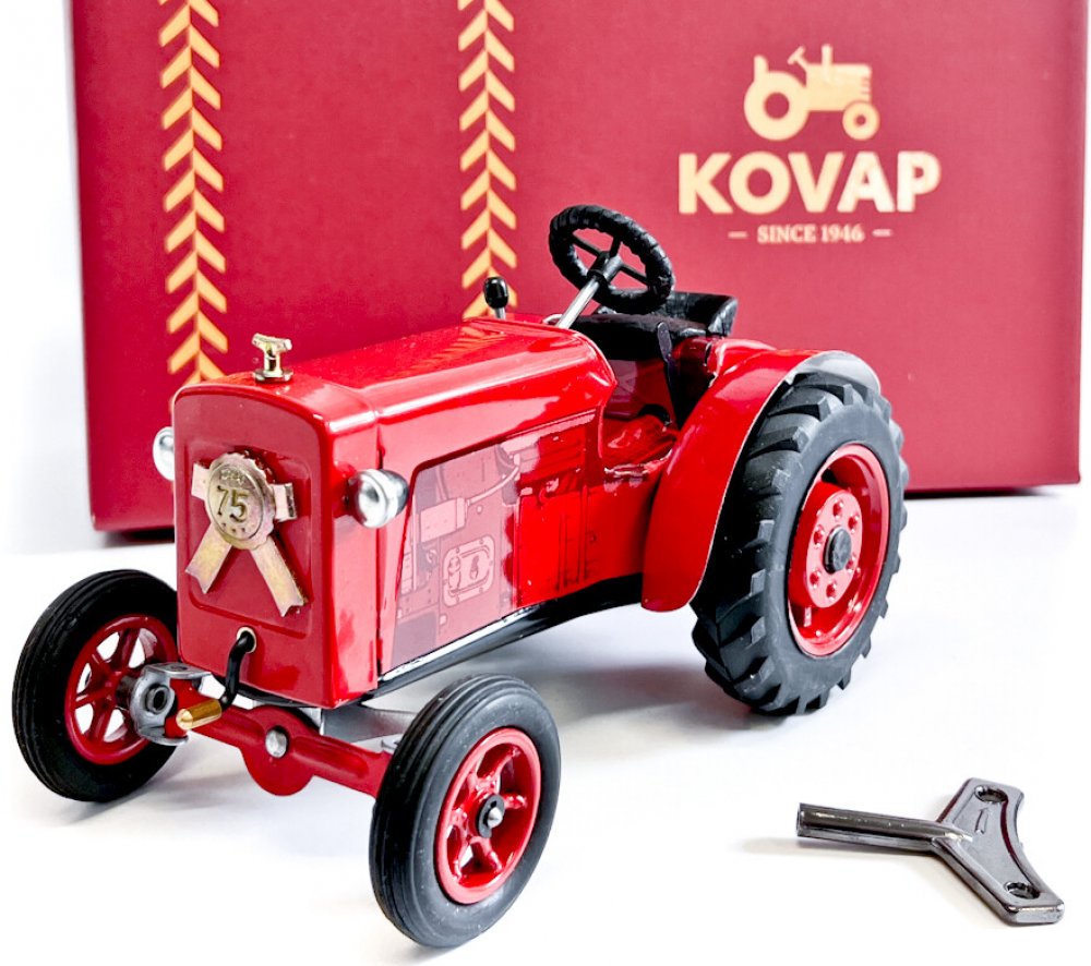 Ač se to zdá neuvěřitelné, tak je to již 75 let od chvíle, kdy bratři Sedlákové položili v Semilech základy naší společnosti! 75 let poctivé a ruční výroby hraček? To už něco znamená! Pojďte s námi oslavit toto výročí speciální edicí traktůrku v omezené sérii 750 kusů od každé ze dvou barev. K dispozici je červené a žluté provedení. Traktůrek s námi vyvíjela Lenka Svatošová ze studia gentle & more. Můžete si ho prohlédnout i za v pražském hračkářství Hugo chodí bos. Specifika výročního modelu: kožený volant a sedačka řidiče loukoťová přední i zadní kola šípové pneumatiky kovová medaile s číslem 75 na masce traktoru víčko chladiče ve tvaru klíčku exkluzivní obal vyrobený pro tuto příležitost tištěný katalog s historií i přehledem produktů je součástí balení Pohyb funkčního modelu zajišťuje unikátní pérový strojek natahovaný klíčkem. Převodovka má 3 rychlosti dopředu, neutrál a zpátečku. Traktor lze volantem skutečně řídit a navíc ho i zabrzdit ruční brzdou. 100% český výrobek sběratelský model krásné řemeslné zpracování měřítko 1:25 pohon na klíček rozměry výrobku: 16 x 9 x 9 cm hmotnost netto/brutto: 0,394/0,990 kg Poznámka: traktůrky nebudou číslovány! Jak na to: Zatáhněte ruční brzdu, zasuňte klíček do otvoru v pravém zadním kole, natahujte po směru hodinových ručiček, dokud neucítíte silnější odpor. Traktor položte na plochu, zařaďte libovolnou rychlost, volantem nastavte směr jízdy a odbrzděte ruční brzdu. Rychlost (směr jízdy) se mění podle zařazeného rychlostního stupně. Upozornění! Nikdy nenatahujte strojek směrem doleva a nepřetahujte ho, může dojít k jeho zničení. Doporučení: Při dodržení těchto rad se budete moci z našich traktorů déle těšit.