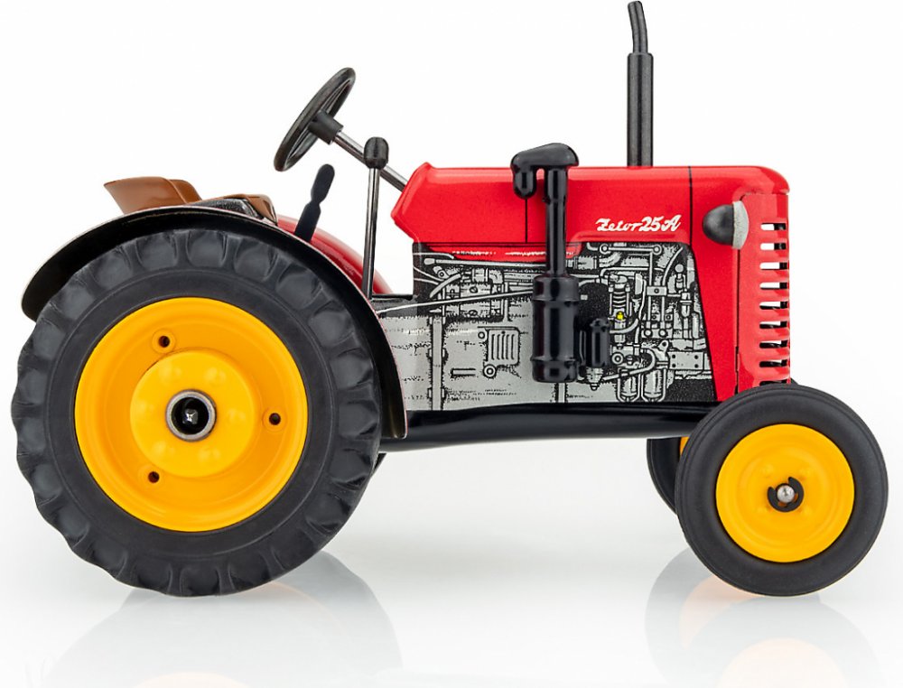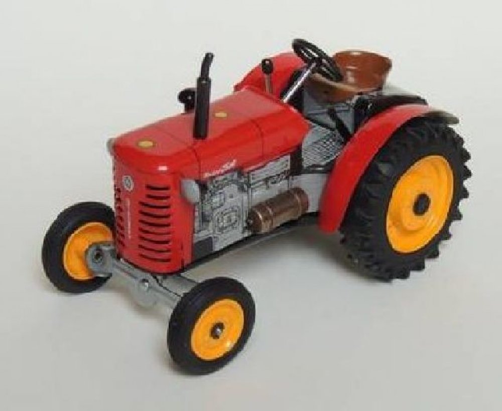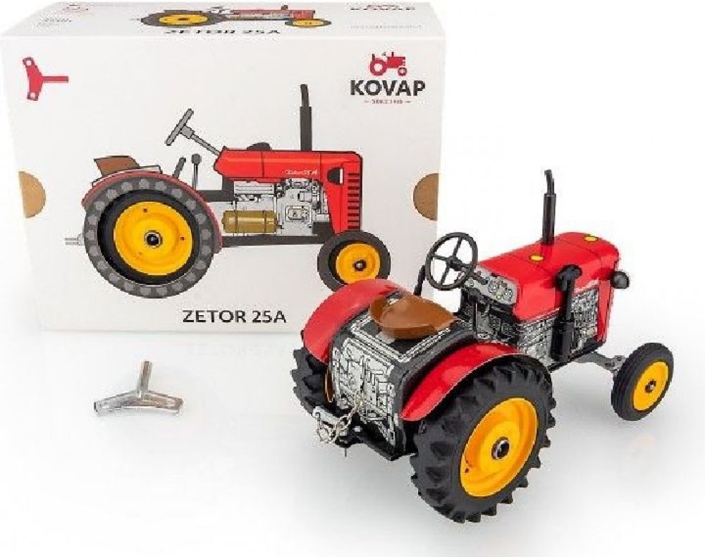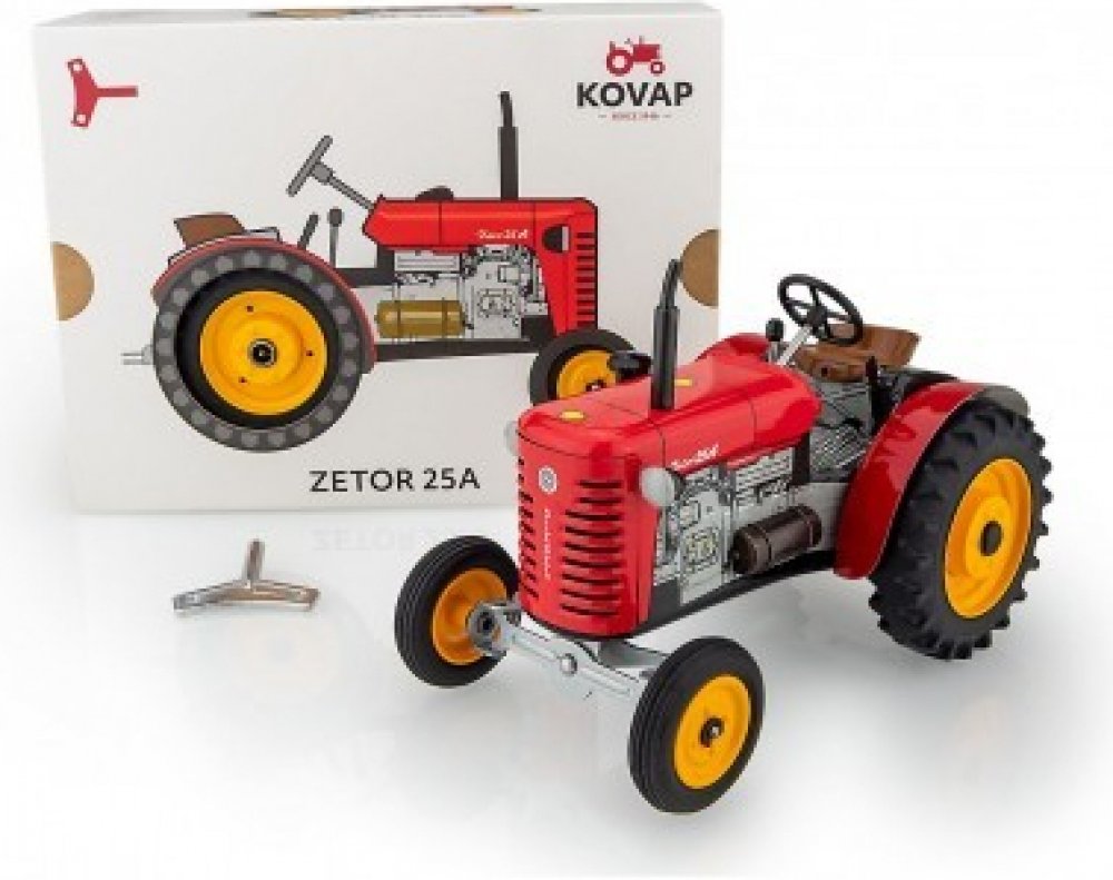 Efektivní, silné, odolné - přesně takové jsou modely brněnského výrobce! A i ty naše, KOVAPácké. Potěšte Zetoráka plně funkčním českým plechovým traktorem, kde pohyb zajišťuje unikátní pérový strojek natahovaný klíčkem. A při hraní si můžete pobrukovat písničku: Jede traktor, je to ZETOR! Přetěte si článek o historii firmy Zetor v našem magazínu. Pohyb traktůrku zajišťuje unikátní pérový strojek natahovaný klíčkem. Převodovka má 3 rychlosti dopředu, neutrál a zpátečku. Traktor lze volantem skutečně řídit a navíc ho i zabrzdit ruční brzdou 100% český výrobek Krásné řemeslné zpracování Certifikát „Bezpečné hračky“ Měřítko 1:25 Pohon na klíček Rozměry výrobku: 15 x 9 x 9 cm Hmotnost: 0.5 kg Jak na to: Zatáhněte ruční brzdu, zasuňte klíček do otvoru v pravém zadním kole, natahujte po směru hodinových ručiček, dokud neucítíte silnější odpor. Traktor položte na plochu, zařaďte libovolnou rychlost, volantem nastavte směr jízdy a odbrzděte ruční brzdu. Rychlost (směr jízdy) se mění podle zařazeného rychlostního stupně. Upozornění! Nikdy nenatahujte strojek směrem doleva a nepřetahujte ho, může dojít k jeho zničení. Při dodržení těchto rad se budete moci z našich traktorů déle těšit. Certifikát ES přezkoušení typu č. 17 0392 T/NB