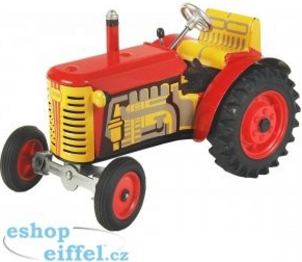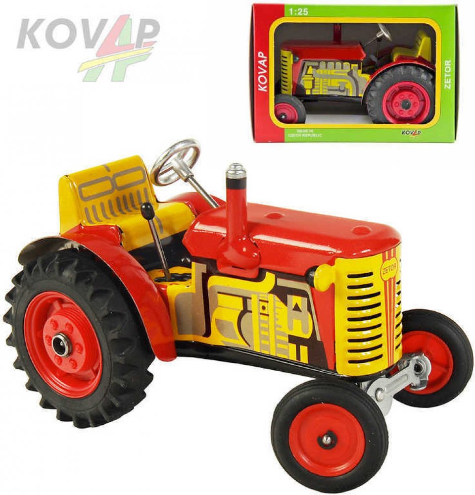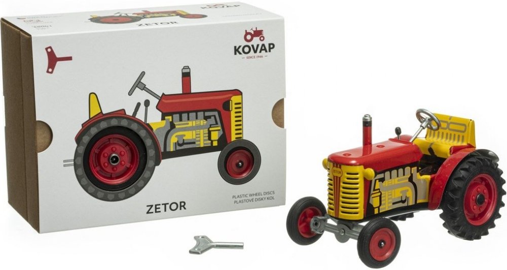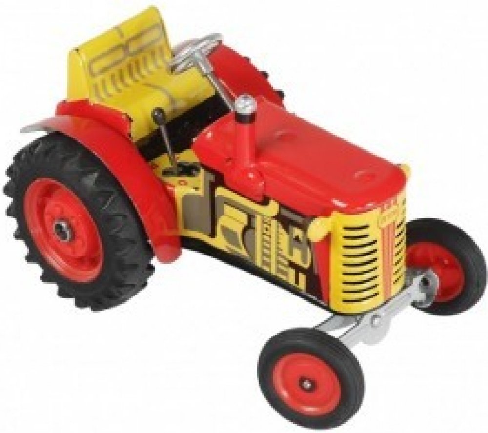 Krásný, velmi kvalitní model funkčního žluto-červeného traktoru z kovu, na natažení na klíček, pro všechny malé zemědělce. Baleno v krabici.