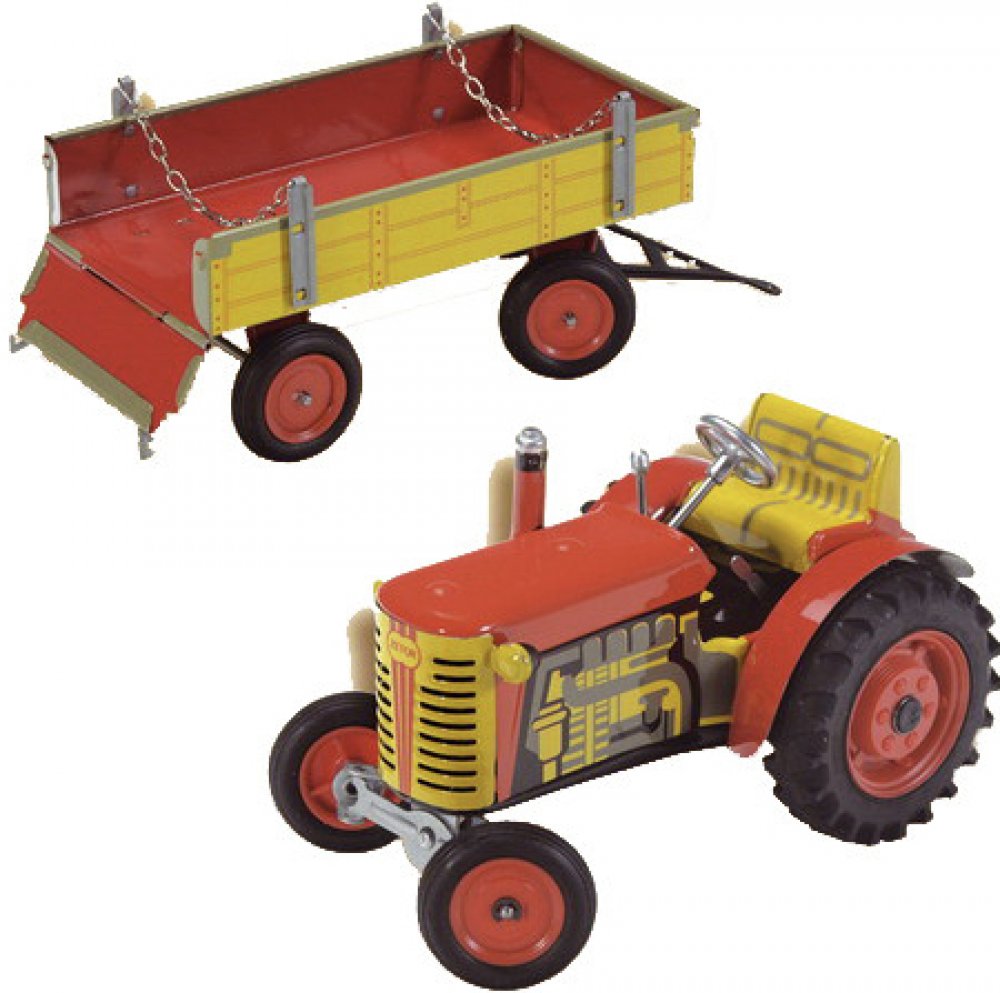 Pohyb traktůrku zajišťuje unikátní pérový strojek natahovaný klíčkem. Převodovka má 3 rychlosti dopředu, neutrál a zpátečku. Traktor lze volantem skutečně řídit a navíc ho i zabrzdit ruční brzdou.