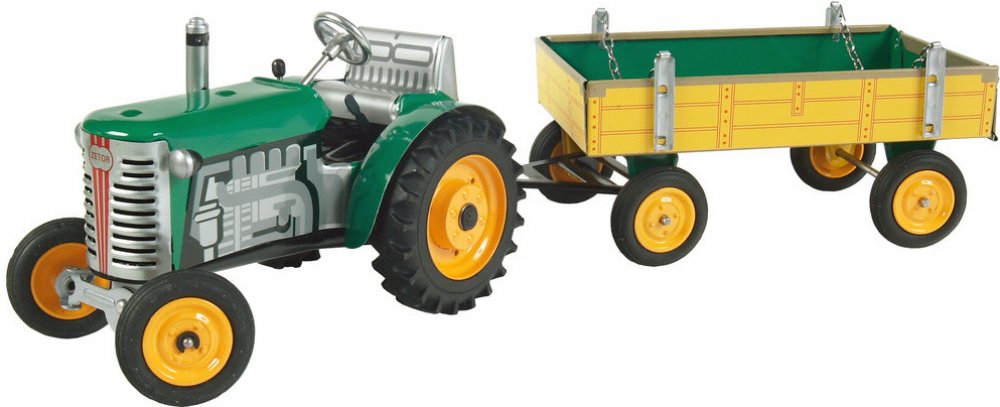 Efektivní, silné, odolné - přesně takové jsou modely brněnského výrobce! A i ty naše, KOVAPácké. Potěšte Zetoráka plně funkčním českým plechovým traktorem, kde pohyb zajišťuje unikátní pérový strojek natahovaný klíčkem. Valník dodávaný k traktoru má sklápěcí zadní čelo. A při hraní si můžete pobrukovat písničku Jede traktor, je to ZETOR.