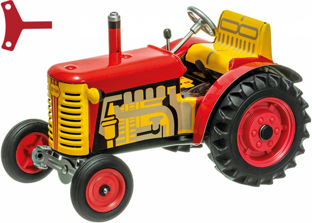 Efektivní, silné, odolné - přesně takové jsou modely brněnského výrobce! A i ty naše, KOVAPácké. Potěšte Zetoráka plně funkčním českým plechovým traktorem, kde pohyb zajišťuje unikátní pérový strojek natahovaný klíčkem A při hraní si můžete pobrukovat písničku Jede traktor, je to ZETOR. Plně funkční český plechový traktor, kde pohyb zajišťuje unikátní plechový strojek natahovaný klíčkem. Převodovka má 3 rychlosti dopředu, neutrál a zpátečku. Traktor lze volantem skutečně řídit a navíc ho i zabrzdit ruční brzdou. 100% český výrobek Krásné řemeslné zpracová „Bezpečné hračky“ Měřítko 1:25 Pohon na klíček Rozměry výrobku: 15x9x9 Hmotnost: 0.5 kg Jak na to: Zatáhněte ruční brzdu, zasuňte klíček do otvoru v pravém zadním kole, natahujte po směru hodinových ručiček, dokud neucítíte silnější odpor. Traktor položte na plochu, zařaďte libovolnou rychlost, volantem nastavte směr jízdy a odbrzděte ruční brzdu. Rychlost (směr jízdy) se mění podle zařazeného rychlostního stupně. Upozornění! Nikdy nenatahujte strojek směrem doleva a nepřetahujte ho, může dojít k jeho zničení. Při dodržení těchto rad se budete moci z našich traktorů déle těšit ES přezkoušení typu č. 17 0392 T/NB