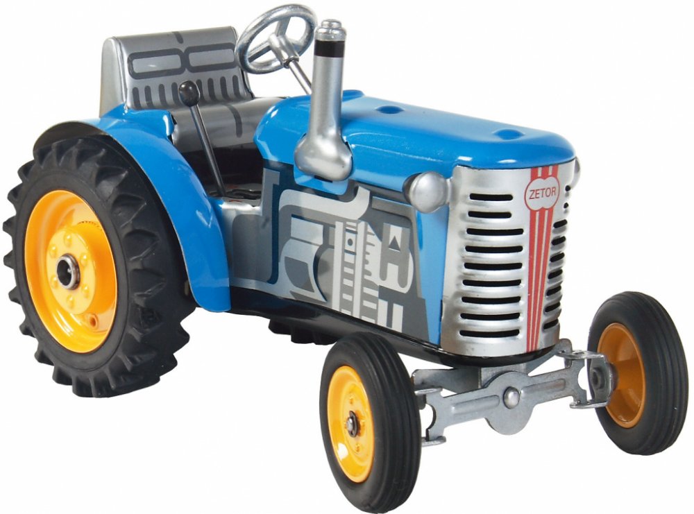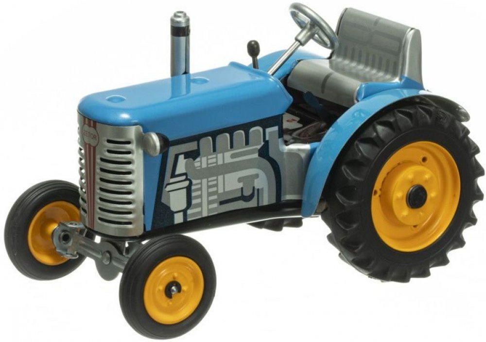 Funkční český plechový traktor, kde pohyb zajišťuje unikátní pérový strojek natahovaný klíčkem. Převodovka má 3 rychlosti dopředu a zpátečku. Traktor lze volantem skutečně řídit a navíc ho i zabrzdit ruční brzdou. Rozměr traktoru 15*9*9 cm, valník 15*8,5*8 cm.