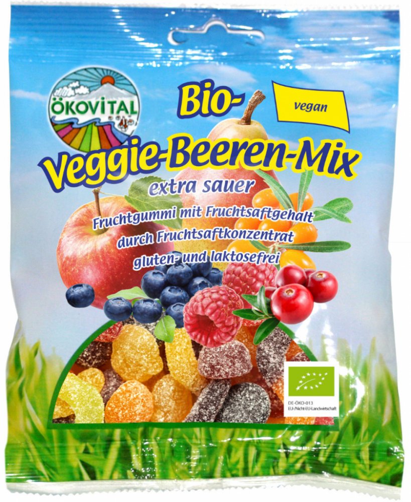 Želé bonbony vegan 80 g BIO ÖKOVITALSložení Glukózový sirup*, cukr*, kukuřičný škrob*, kyseliny citrónová, jablečná, mléčná, zahuštěná ovocná šťáva* 1,52 % (z jablek* 0,82 %, hrušek* 0,18 %, borůvek* 0,14 %, rakytníku* 0,14 %, brusinek* 0,12 %, malin* 0,12 %), regulátor kyselosti: citrát sodný a vápenatý, želírující látka: pektin, přírodní aromata (hruška, jablko, maliny, černý rybíz, pomeranč, borůvka), barviva: rostlinné výtažky* (z dýní*, jablek*, bezinek*), karamelový sirup*.*produkt kontrolovaného ekologického zemědělstvíVýživové údaje na 100 gEnergetická hodnota1453 kJ / 342 kcalTuky0,1 gZ toho nasycené mastné kyseliny0,1 gSacharidy83,0 gZ toho cukry53,0 gVláknina0,0 gBílkoviny0,2 gSůl0,2 g