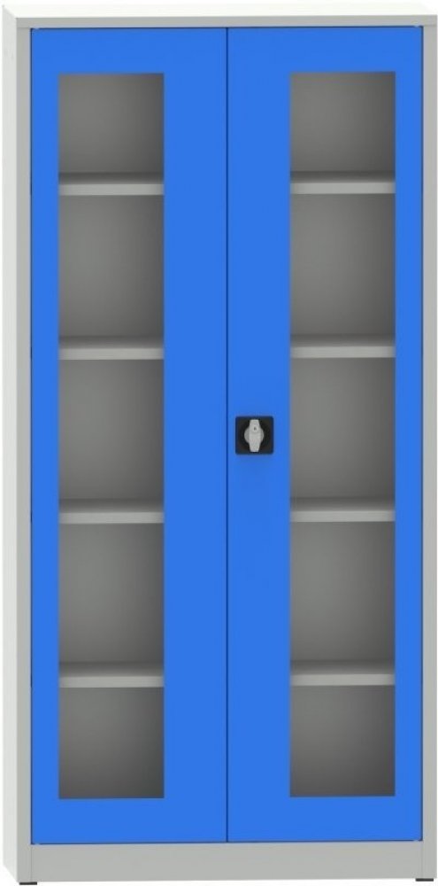 Dvoudveřová kovová svařovaná skříň s prosklenými dveřmi plexisklem, šířka 950, výška 1950, hloubka 600 mm, 4x přestavitelná police. Barva korpusu RAL 7035 světle šedá, dveří RAL 7035 světle šedá a RAL 5012 modrá.