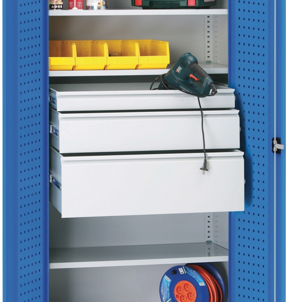· přídavná zásuvka do kovových skříní s katalogovým číslem 178754 · povrchová úprava práškovým lakem šedá RAL 7035 · z plechu tloušťky 0,7 mm · nosnost zásuvky 40 kg · zásuvky jsou opatřeny kuličkovými pojezdy s vysunutím ve 100% hloubky · pozor, u skříní musíte v dílcích počítat vždy 1 polici navíc (vrchní zásuvka má vždy nad sebou polici)